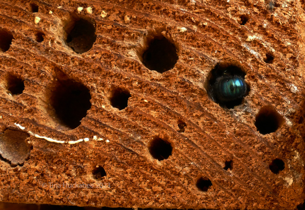 The adult Blue bees flying around now are the eggs laid and hatched a year ago. These are solitary bees and unlike honeybees, not part of a hive. Females lay their eggs in holes of wood or masonry and don’t have a crew of sisters to care for them. The adults prepare the nests by gathering a mix of pollen and nectar known as “bee bread” and then lay their eggs on that bread to nurture the larvae once hatched. Each egg is sequestered in its own room to grow and develop, each room separated by a mud-n-leaf matter wall. Female eggs are laid in the deep end of the hole, the male eggs toward the front of the hole.