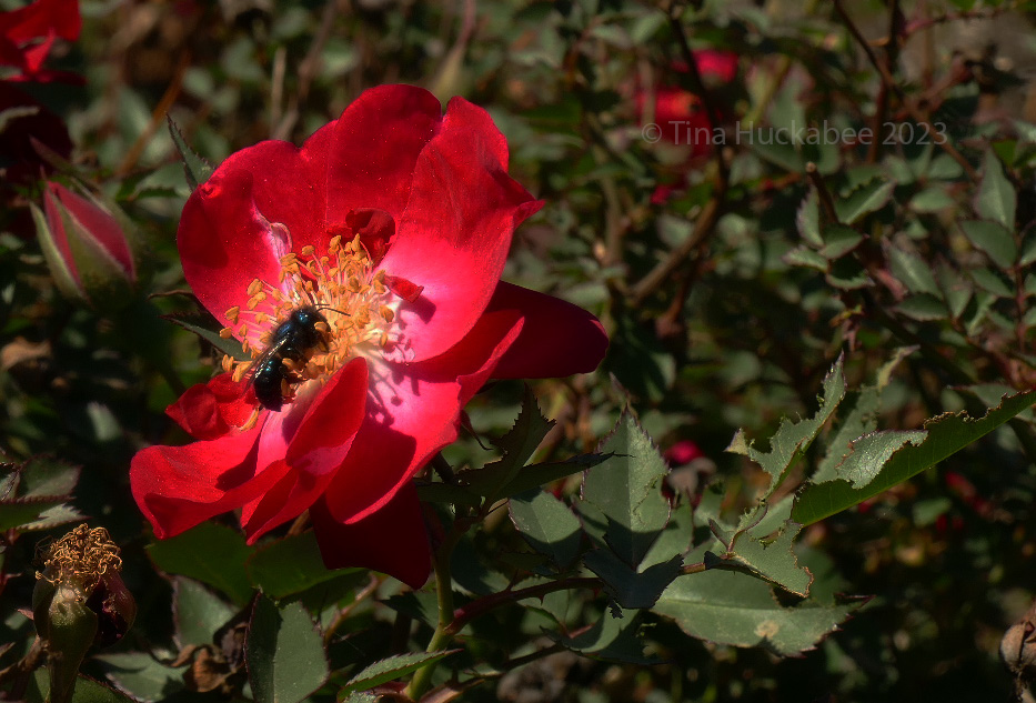 It’s been a good spring for these bees, more activity than I recall from last year. I’ve seen many working around the Martha Gonzales roses, nibbling leaves to add to the nest sites.