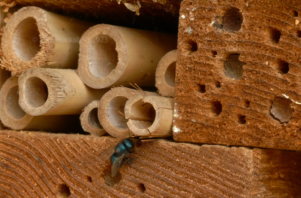 Near this bee apartment, made from untreated wood with drilled holes and bamboo tubes, there is constant activity, flying in, zooming out, and dotting the wood with metallic color.