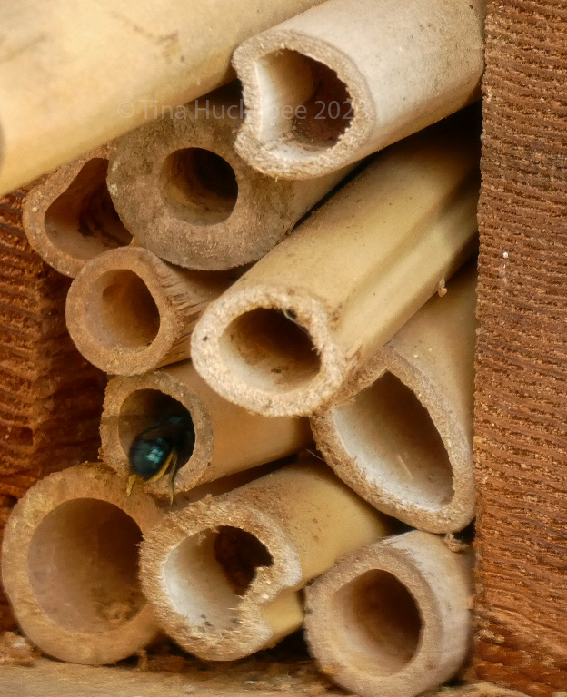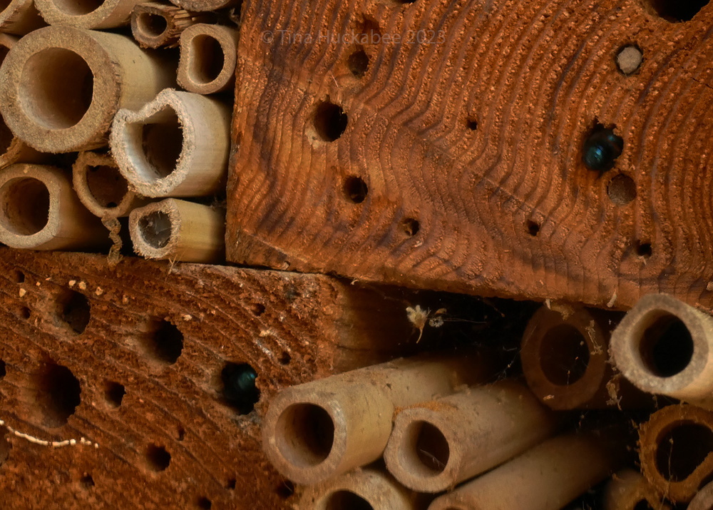 Near this bee apartment, made from untreated wood with drilled holes and bamboo tubes, there is constant activity, flying in, zooming out, and dotting the wood with metallic color.
