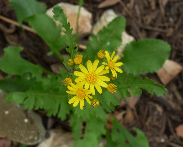 There’s still plenty of pop with these diminutive blooms; there’s no denying that yellow is bright. But last summer, most of the individual plants in my small patch of groundsels succumbed to the heat and drought. I didn’t realize that the soaker hose buried in this garden had developed a leak. While a couple of plants not far from the groundsels received good soaks when during their twice per month drink, these poor little things got none of the wet stuff. That garden boo-boo occurred during an especially hot and dry spell in August and September, and it wasn’t until the rains returned and the temperatures softened that I discovered that there were few remaining groundsels.