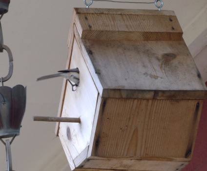 In my recent post, Dummy, I wrote about an intrepid pair of Black-crested Titmouse, Baeolophus atricristatus, building a nest in a hanging bird house that Bee/Bird Daddy built some time ago. It was the first avian interest shown in this house, and I was tickled that Titmice chose this bit of bird real estate. Some of the cutest birds around, Black-crested Titmice are frequent visitors to my birdbaths and black-oiled sunflower feeders, and are year-round resident songbirds in Central Texas. Over the course a few days, I enjoyed observing their nesting preparations, as I’ve never been privileged to see those activities up-close.