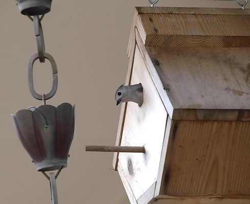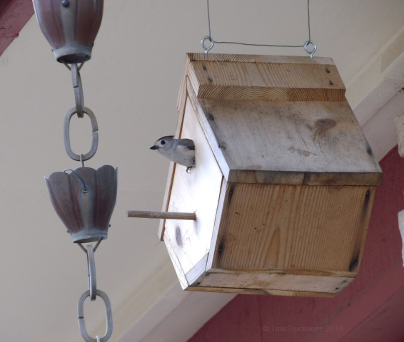 I’ve learned some things with this experience. Next spring, early in the season, I’ll remove the rain chain and will also re-string the fishing line around the nest box. I’m also planning to saw off the house perch. It’ll limit the Titmice from landing, but as I observed the Titmice entering the house, they mostly flew directly to the entrance, without a perch-stop. However, the House Sparrows perched on the perch, blocking the Titmice from entering the house.