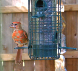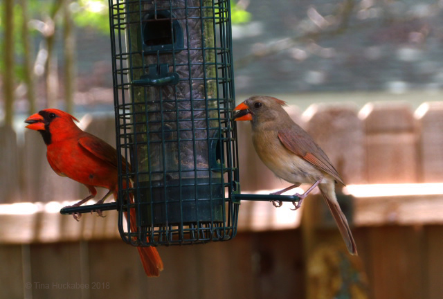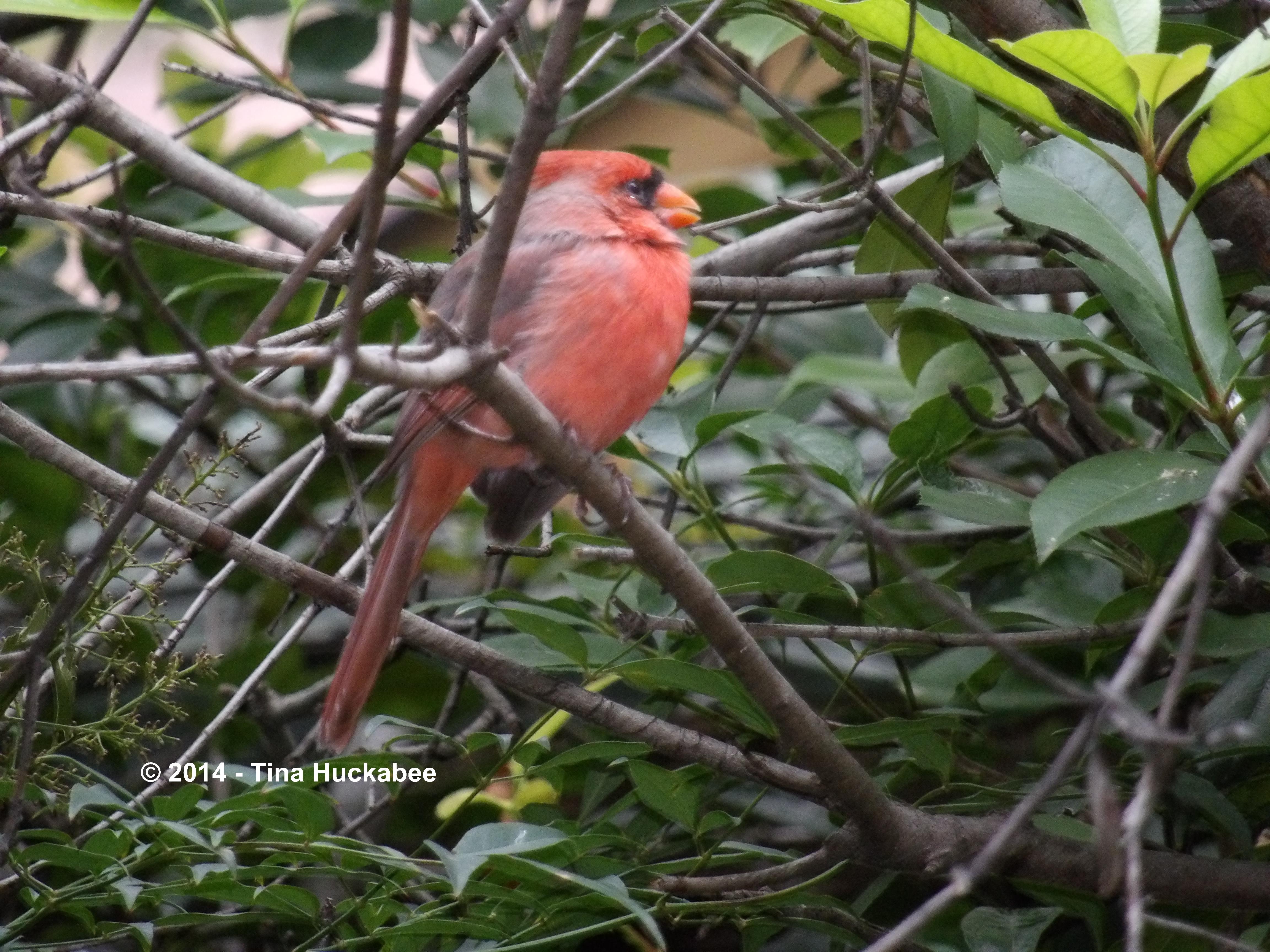 …never nest in my garden, but are regular visitors to the trees, feeders, and water features. They raised two chicks this spring and early summer; both babies have fledged and are learning to garden-hop. I haven’t managed good shots of the girl, but the boy is working on his red attire.