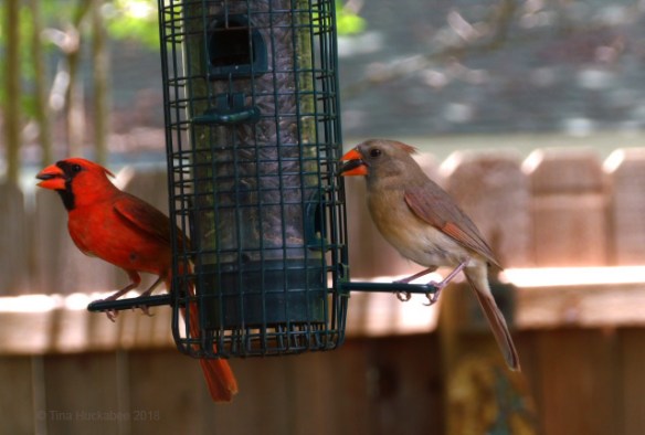 He’s a bit mottled in this shot, taken in mid-June. I’ve noticed recently that his red feathers are becoming more dominant, lessening his awkward teen appearance. Thank goodness! Soon, he and his sister will move on to a different part of the neighborhood, both in search for mates for next year.