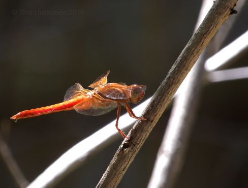 This male is a bright orange, his mate of a paler hue. I’ve observed her laying eggs in the pond several times this summer–more skimmers in our future, unless the fish eat all the larvae.