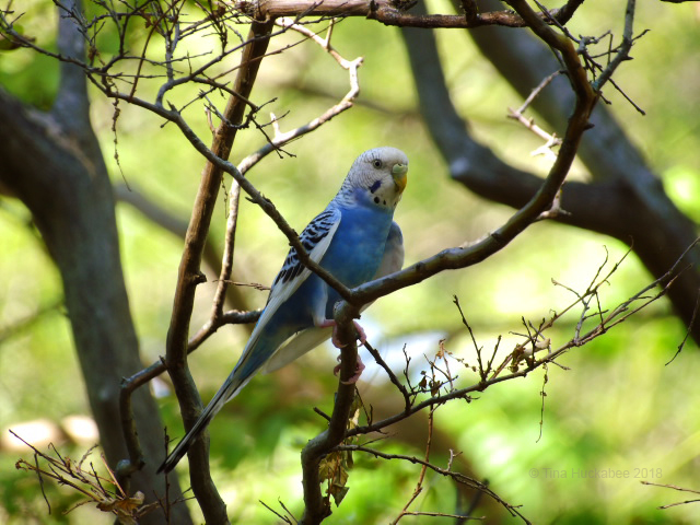 Austin hosts numerous communities of Monk parakeets, Myiopsitta monachus. I see them flying over my neighborhood and hear their loud cawing, but only rarely do they land in my garden. I assume this Blue parakeet is part of a Monk group, though he/she could also be an escaped or lost pet. The bird was eyeing my pond, but was in the tree for just a few minutes.