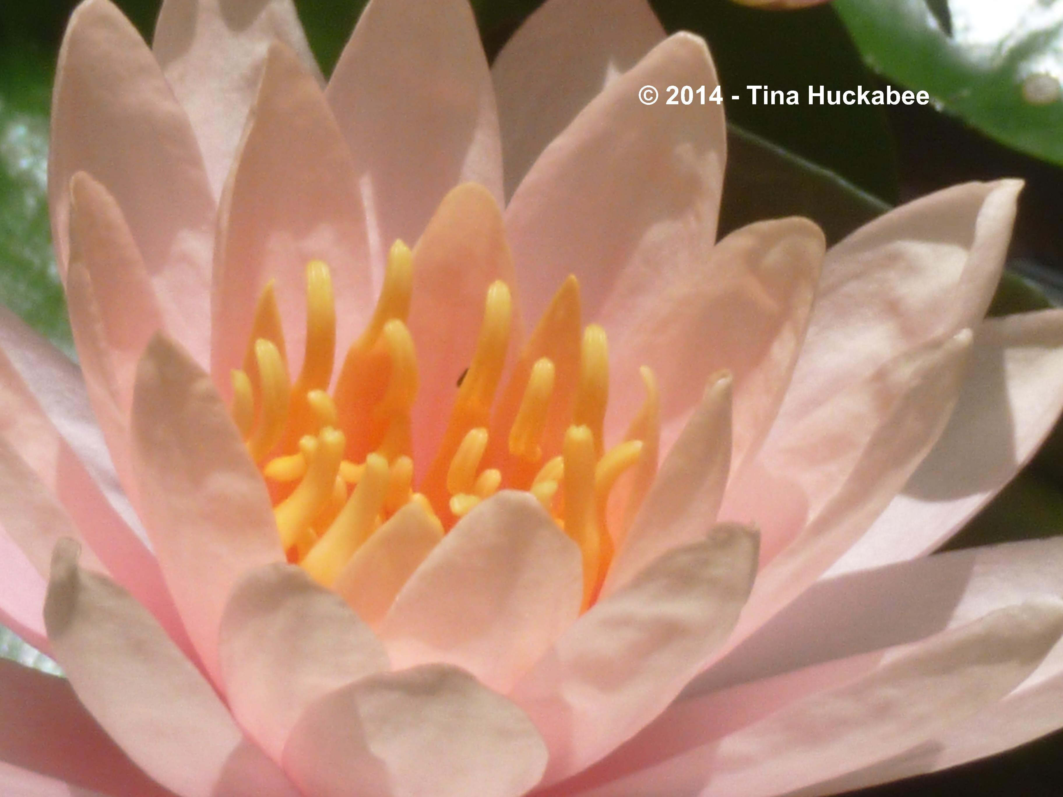 My pond gurgles and flows in increasing shade each year. The water isn’t impacted by the shady situation, but the pond flowers bloom less, though still manage some lovely and welcome flowers. These pink pretties are waterlily Nymphaea ‘Colorado’. Soft pink petals paired with golden centers, the flowers float among fish and fins and lily-pad foliage.