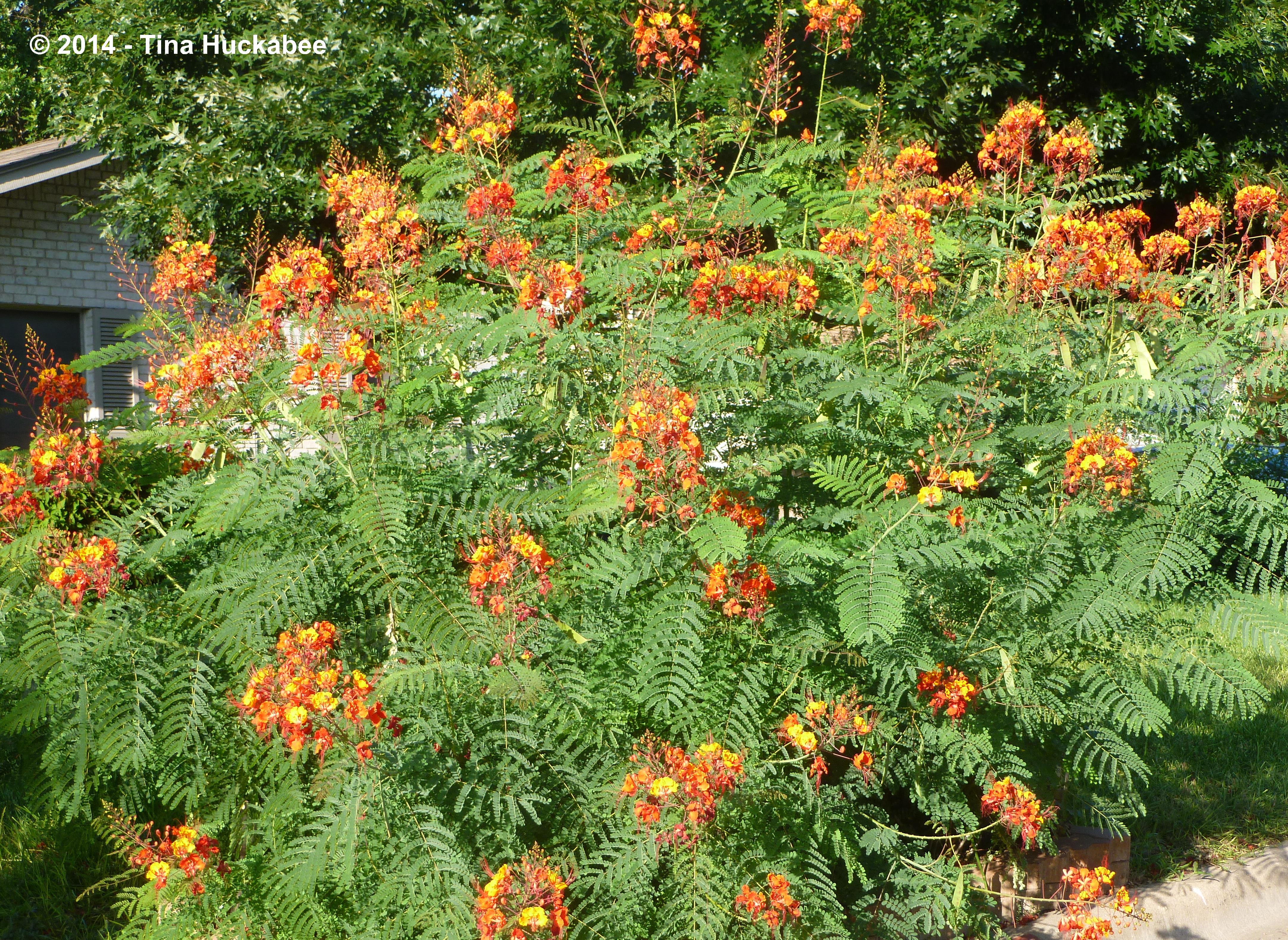 Another summer bloomer grown in Central Texas is the Pride of Barbados, Caesalpinia pulcherrima. It’s an eye-popping plant with shocking orange and yellow flowers, along with dramatic red stamens. It’s hard to ignore and why would you want to?