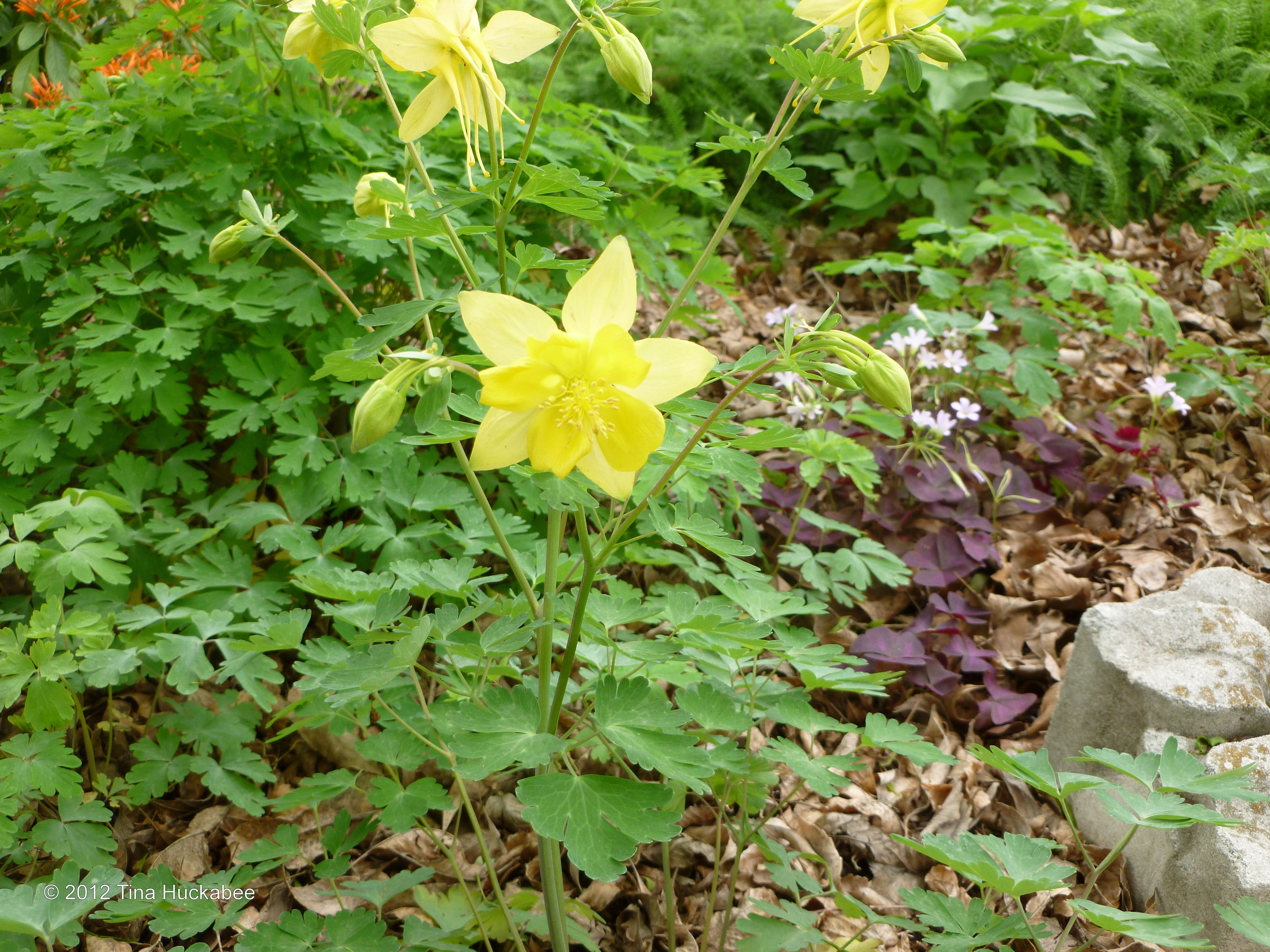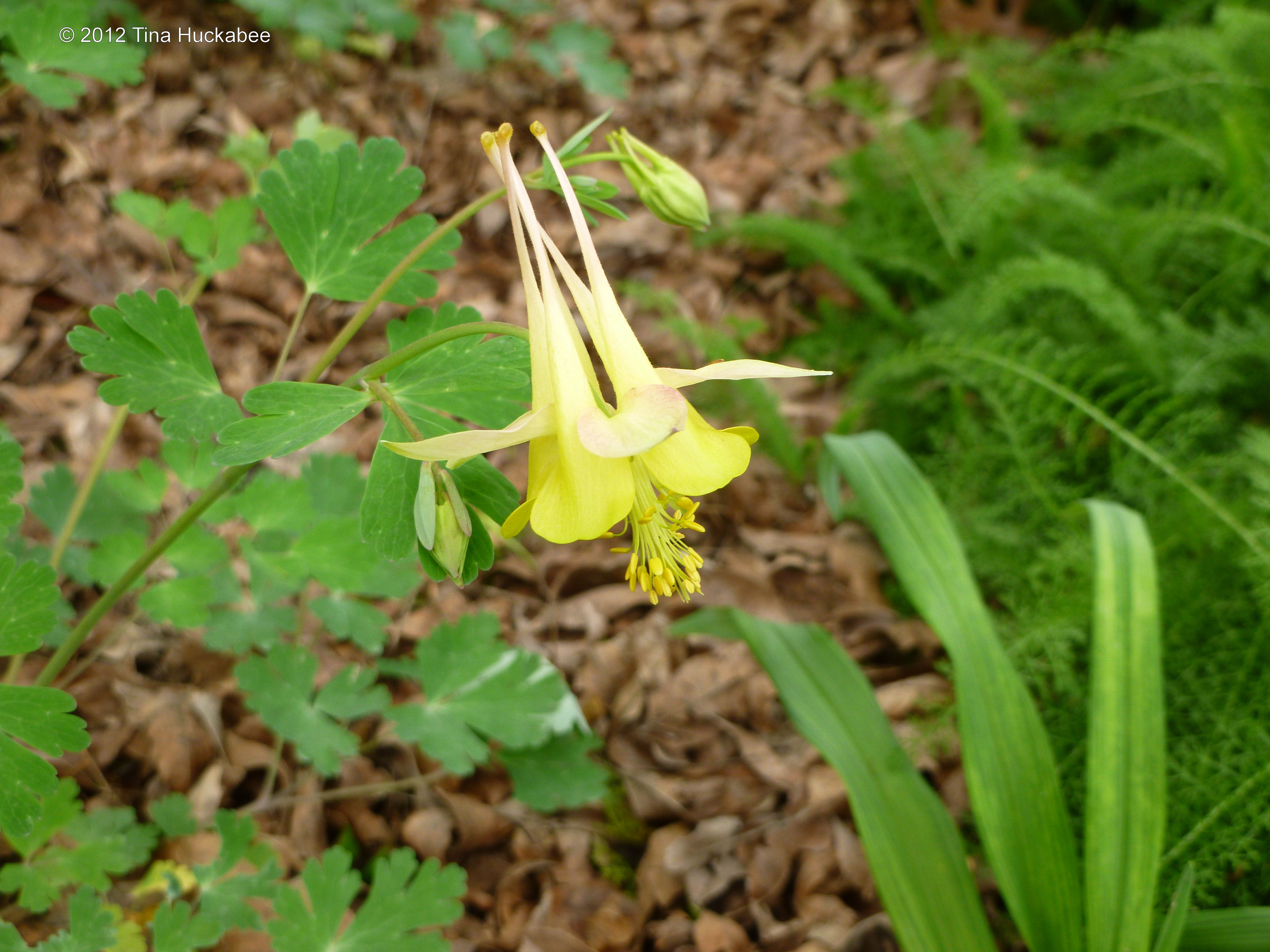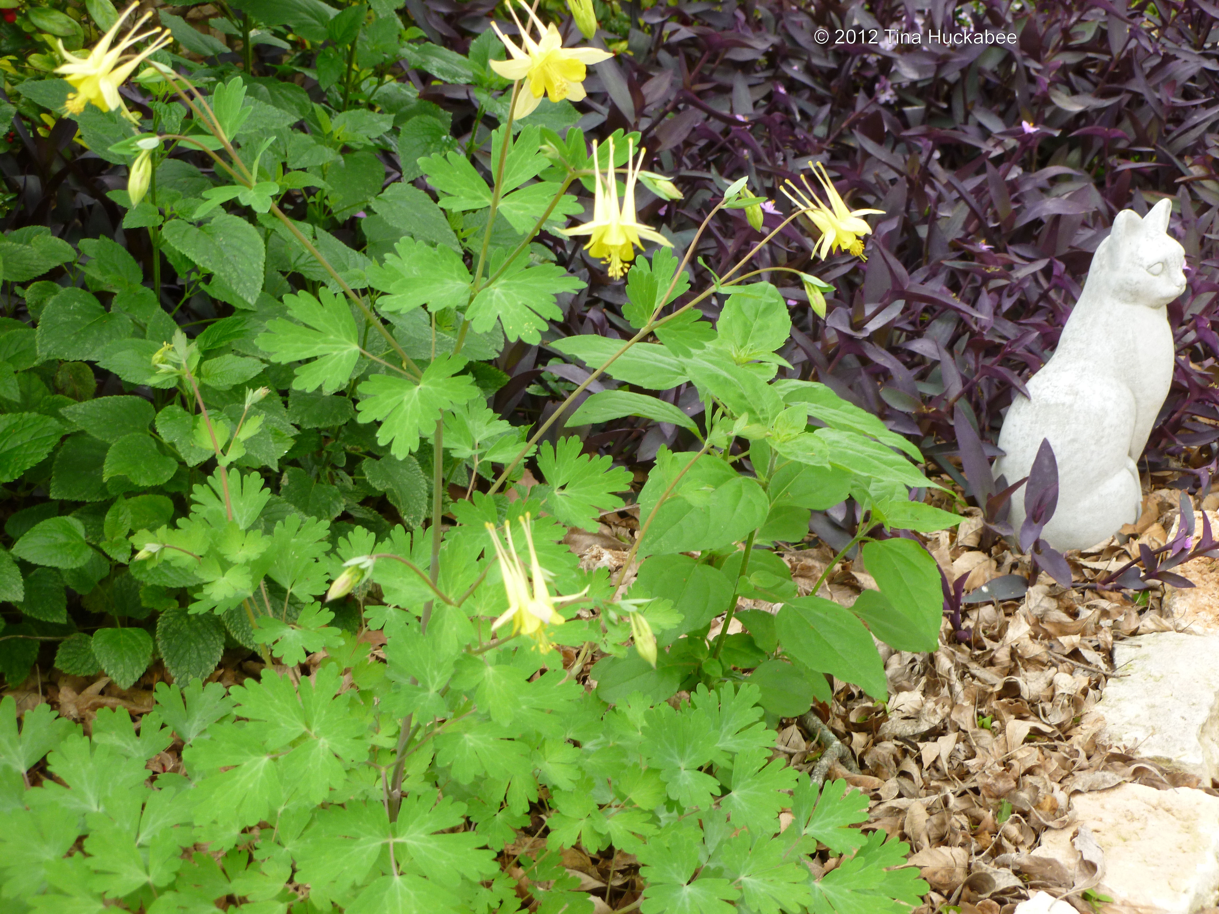 Over the years, they’ve re-seeded and I now have a variety of hybrids–yellow flowers of differing sizes with a pink blush on the spurs, petals or sepals.