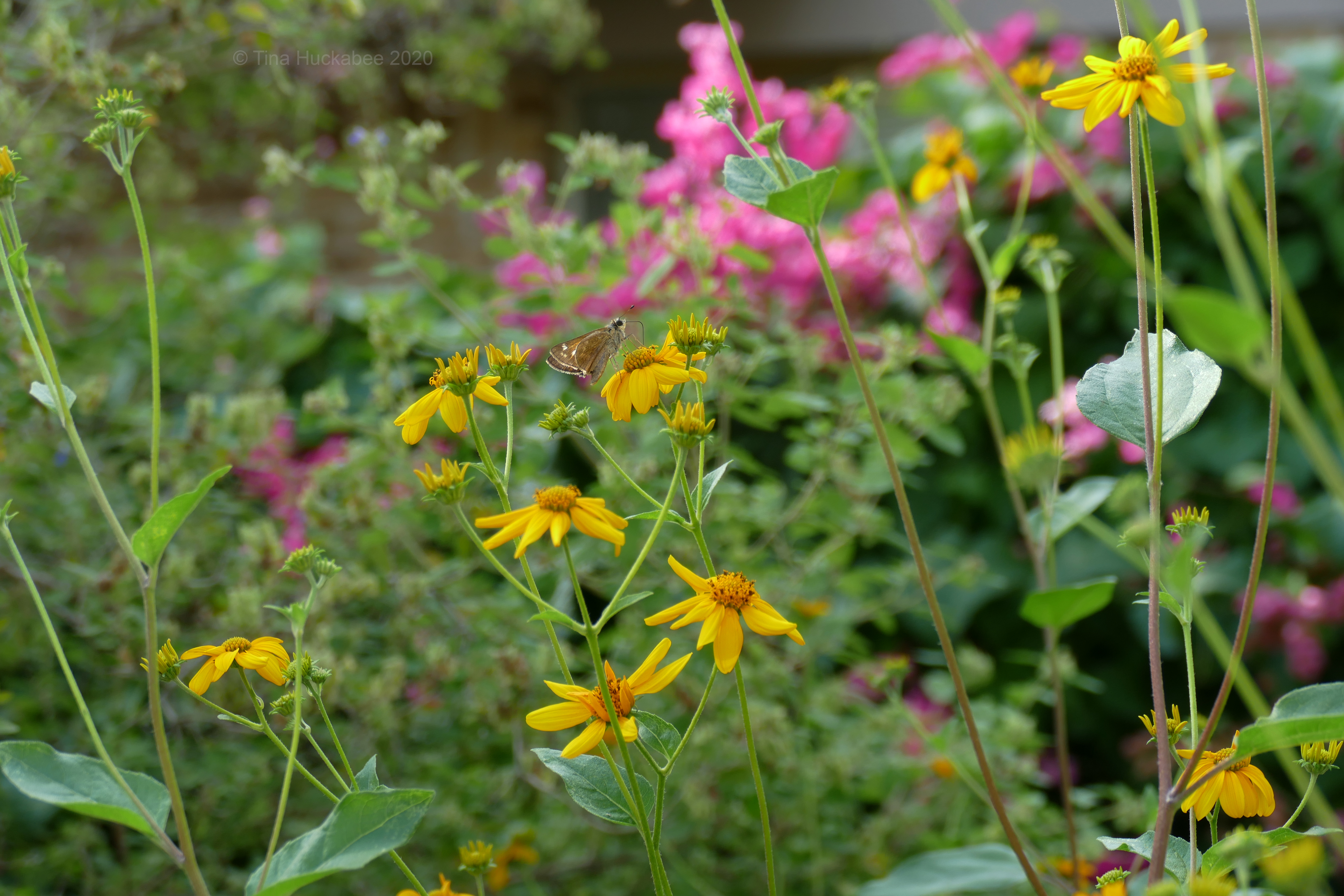 Tres mariposas, three butterflies–all in a row! Two Queens (left and center) and one Monarch, far right. Did I mention that these butterflies love Gregg’s Mistflower? Often there are even more individuals snacking at the patch of flowers.