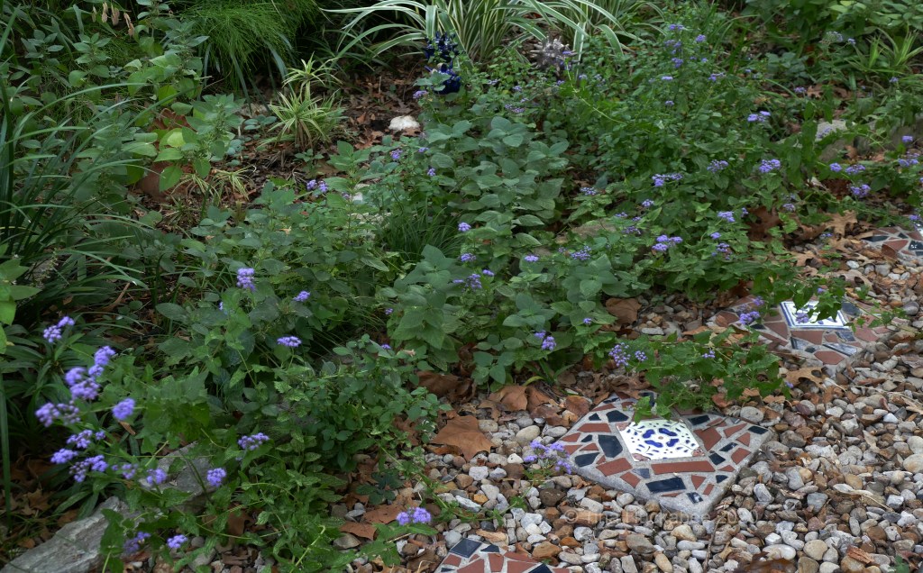 As of mid December, my garden has experienced only the slightest touch of a light freeze, so some plants are still blooming, especially those plants which hug close to the ground. The late season availability of flowers makes for happy, busy pollinators during sunny days.