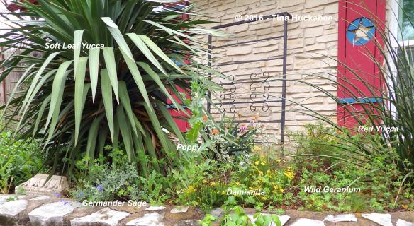 I planted the Soft Leaf Yucca, Yucca recurvifolia and the Red Yucca, Hesperaloe parviflora as anchor plants in this bed because they are both evergreen and grow to respectable sizes. Most of the other plants are smaller shrubs or groundcover-type perennials: some are evergreen, some are herbaceous perennials, and a couple are annuals. There are also some other native perennials, a smaller yucca, and a native perennial grass, all located out of view of these photos.