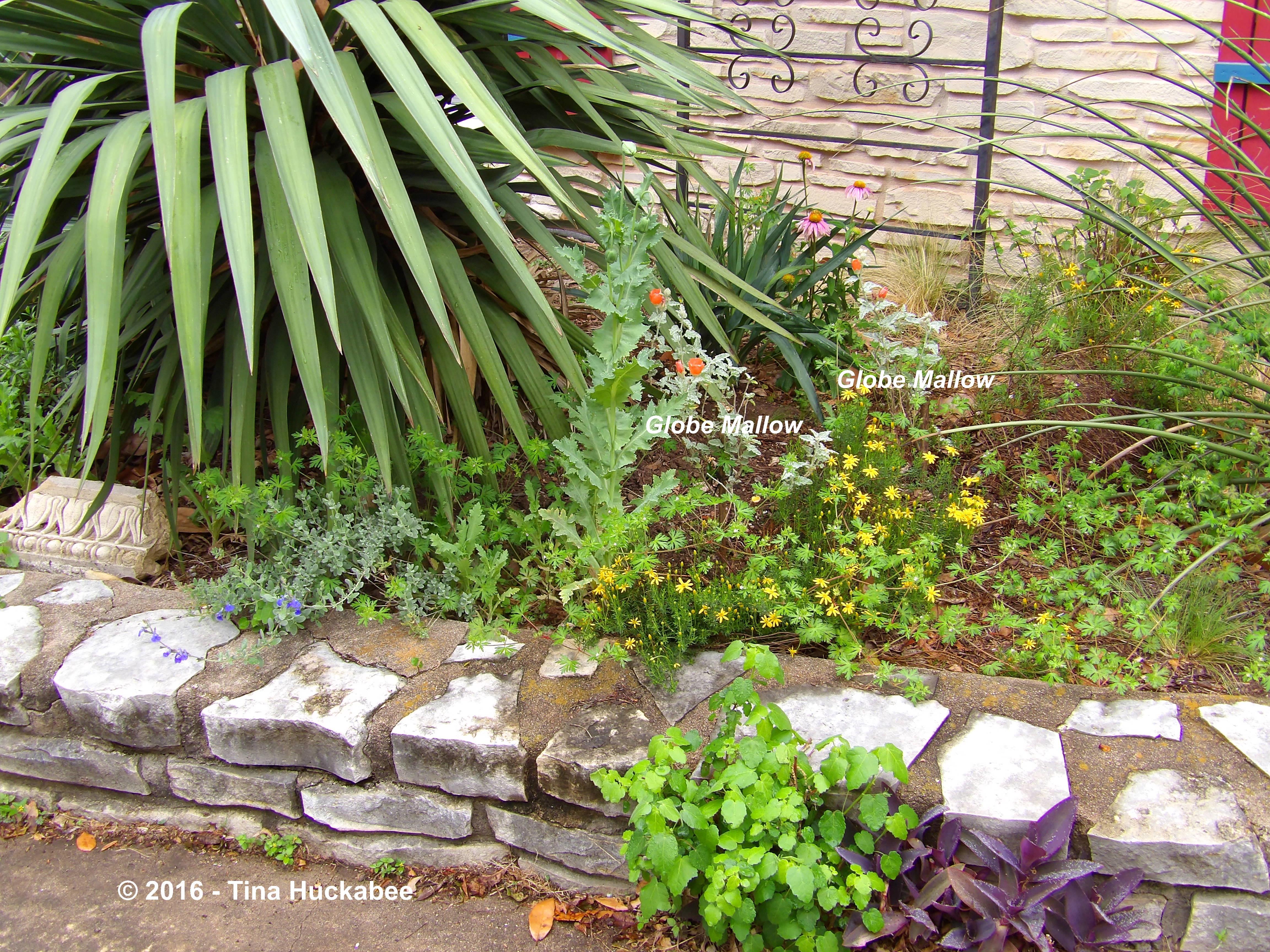 A wider look includes both newly planted Globe Mallow, Sphaeralcea ambigua allowing for some silvery leaf action,