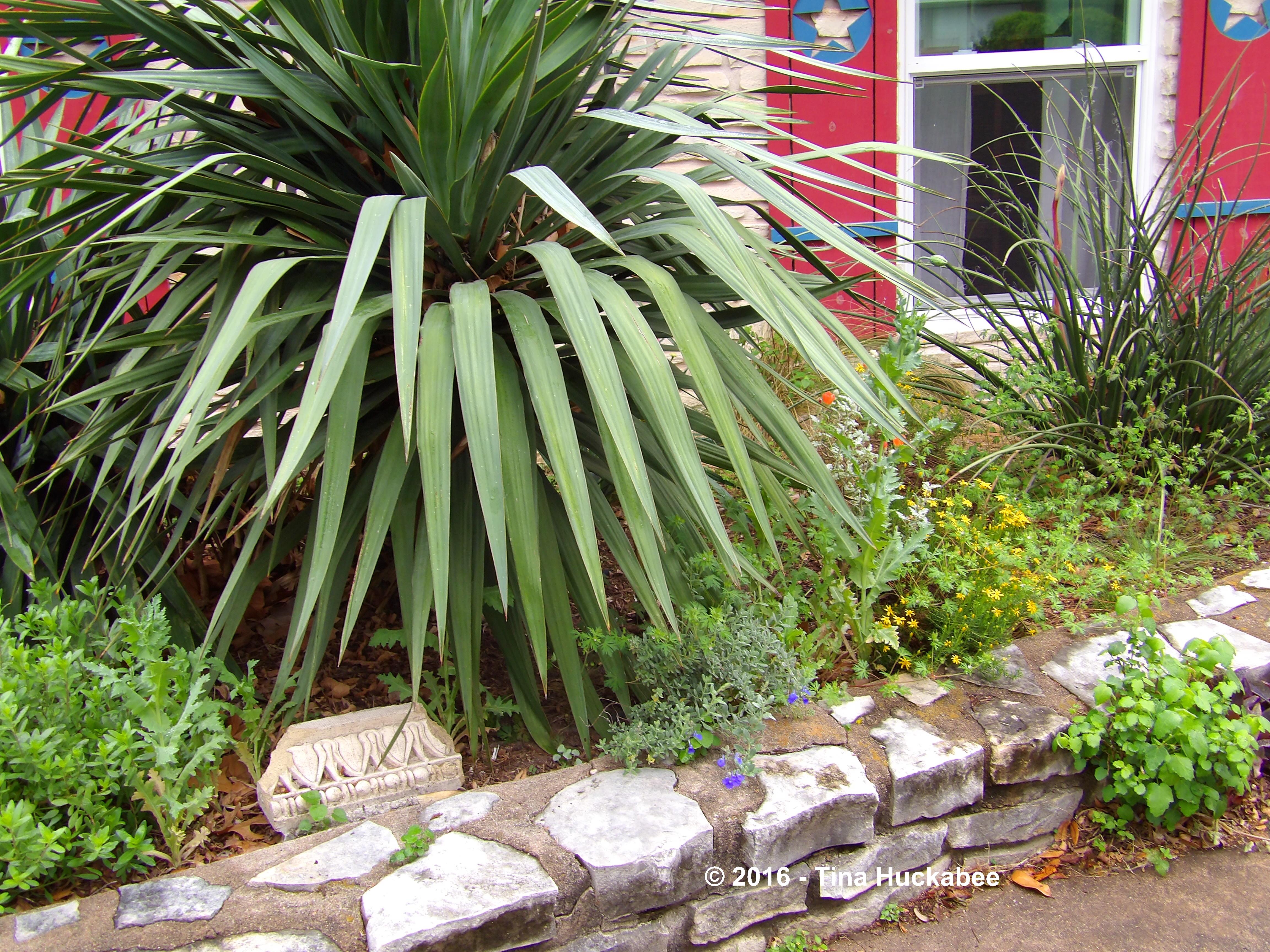 I planted the Soft Leaf Yucca, Yucca recurvifolia and the Red Yucca, Hesperaloe parviflora as anchor plants in this bed because they are both evergreen and grow to respectable sizes. Most of the other plants are smaller shrubs or groundcover-type perennials: some are evergreen, some are herbaceous perennials, and a couple are annuals. There are also some other native perennials, a smaller yucca, and a native perennial grass, all located out of view of these photos.