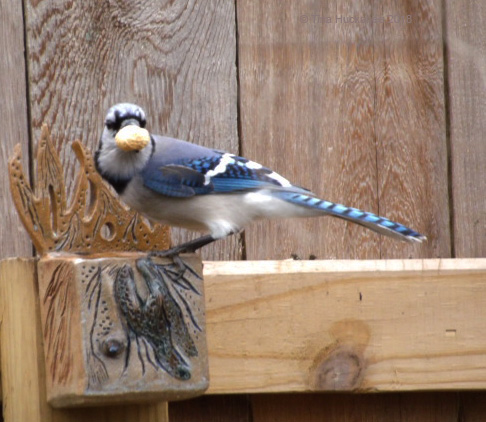 After several minutes of nibbling, the youngster snatched a full peanut and shortly after this shot, flew to the nearby oak tree to enjoy his treat. The chastened blue jay was a bit gormless for a time, eventually hopping to the feeder for its share of the peanut booty.