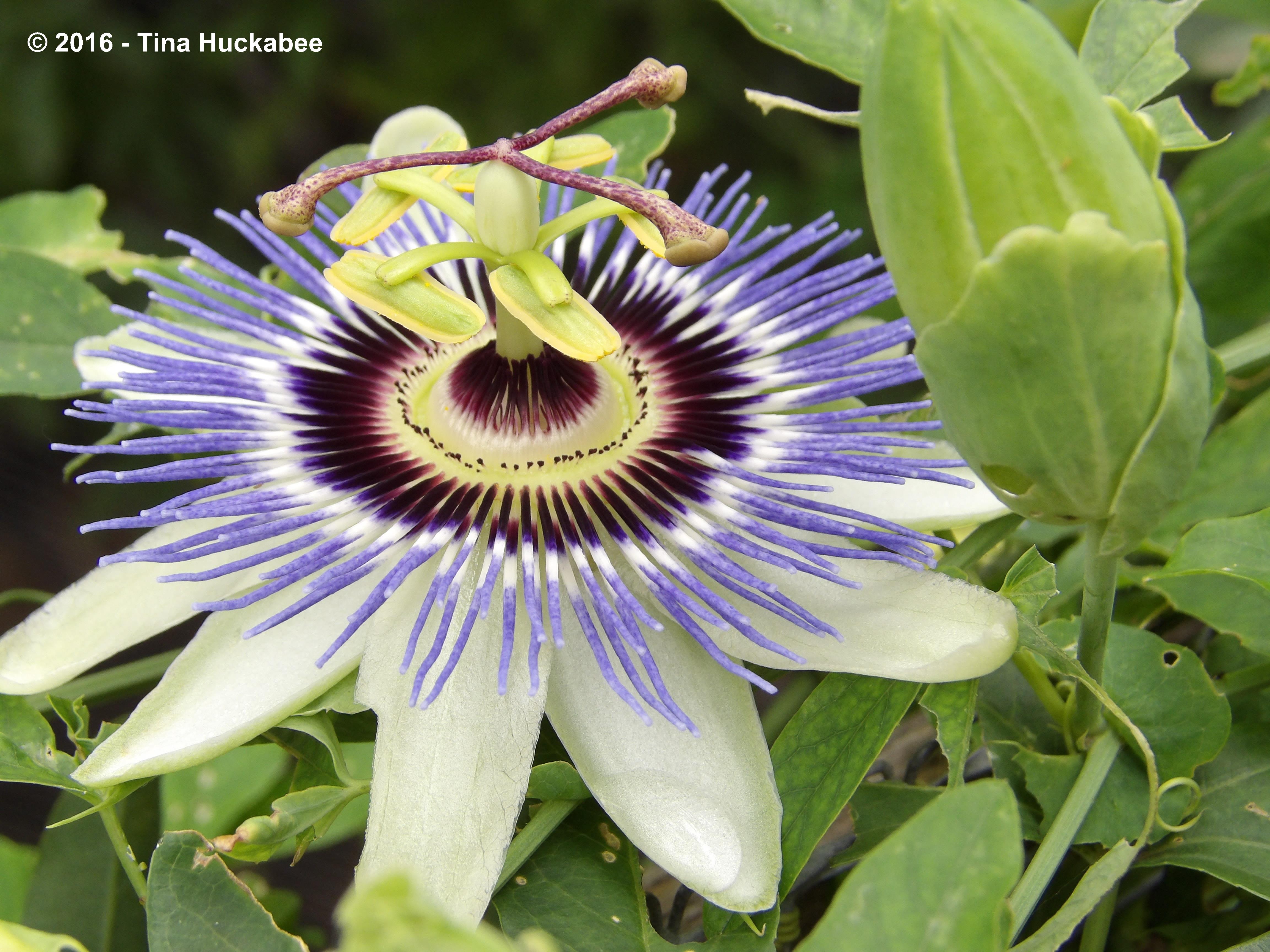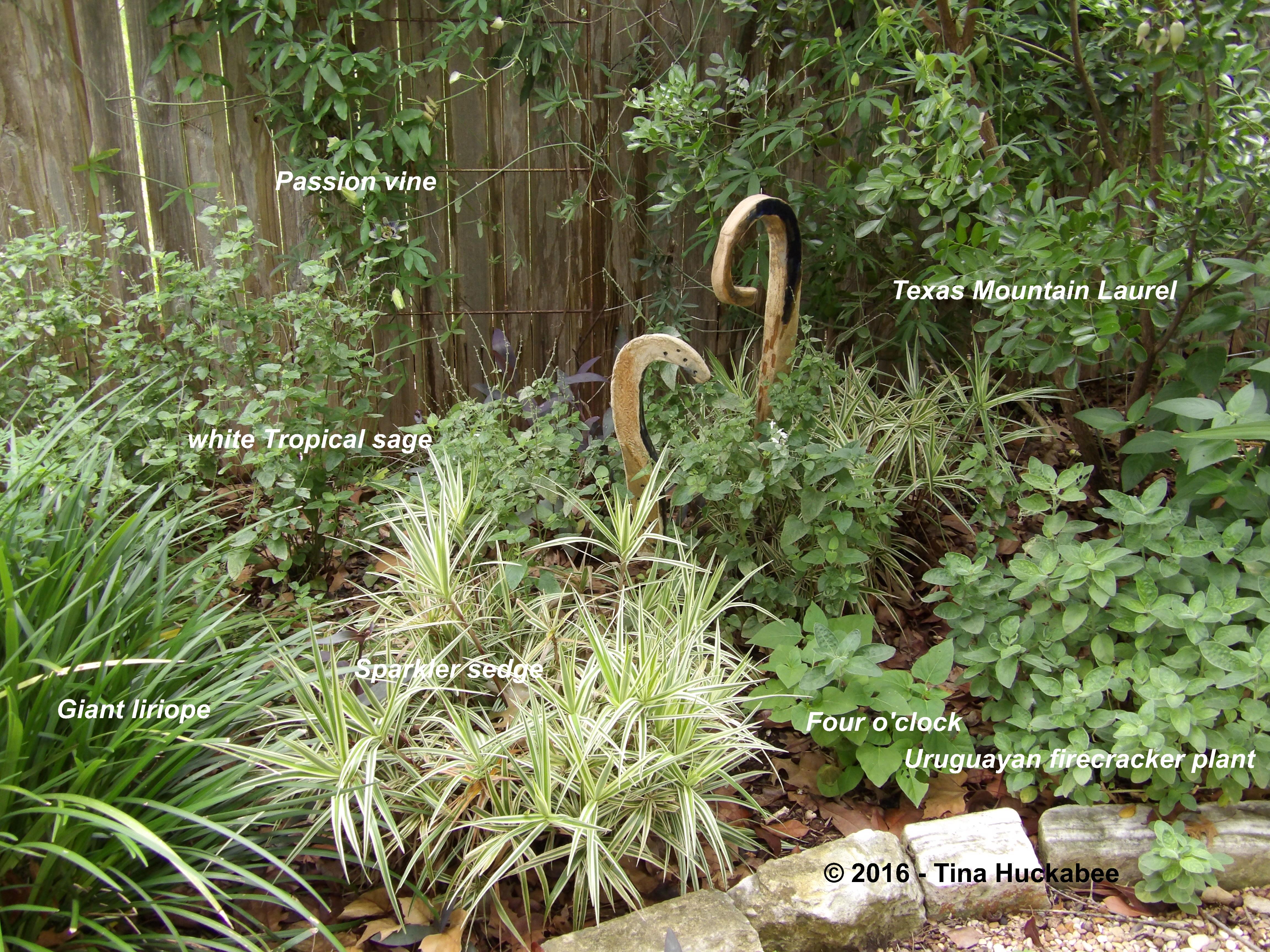 Toward the front, the Four o’clock is deciduous, but blooms a deep, fragrant pink flower at night during the growing season. If I irrigated more, I’d get blooms from the Uruguayan Firecracker, but this is a dry garden–I must content myself with its lovely foliage, which is the main reason I planted it. The white-blooming Tropical sage, Salvia coccinea, (clustered at the back and not currently much in bloom) is meh in the foliage department, but the bees and I adore the white blooms, which appear throughout the growing season. The Texas Mountain Laurel, Sophora secundiflora, sports evergreen foliage year-round, plus adds height and width to this area, contrasting with the smaller perennials. Behind that and draping along the fence is an evergreen, Blue passion-flower vine, Passiflora caerulea, which is a host plant for the Gulf Fritillary butterfly. Along with its twining foliage, the Passion vine blooms magnificently and bees and butterflies appreciate that.