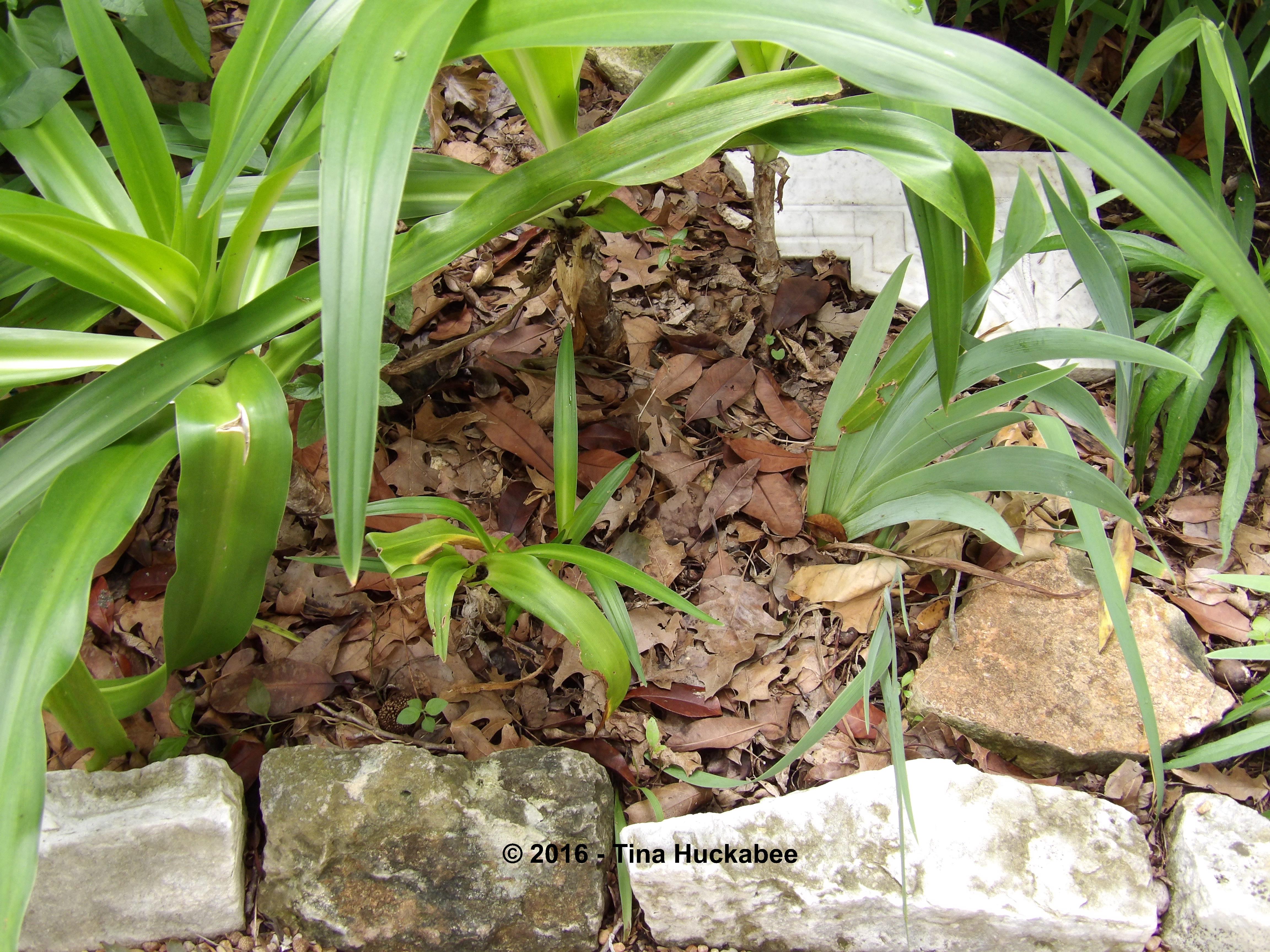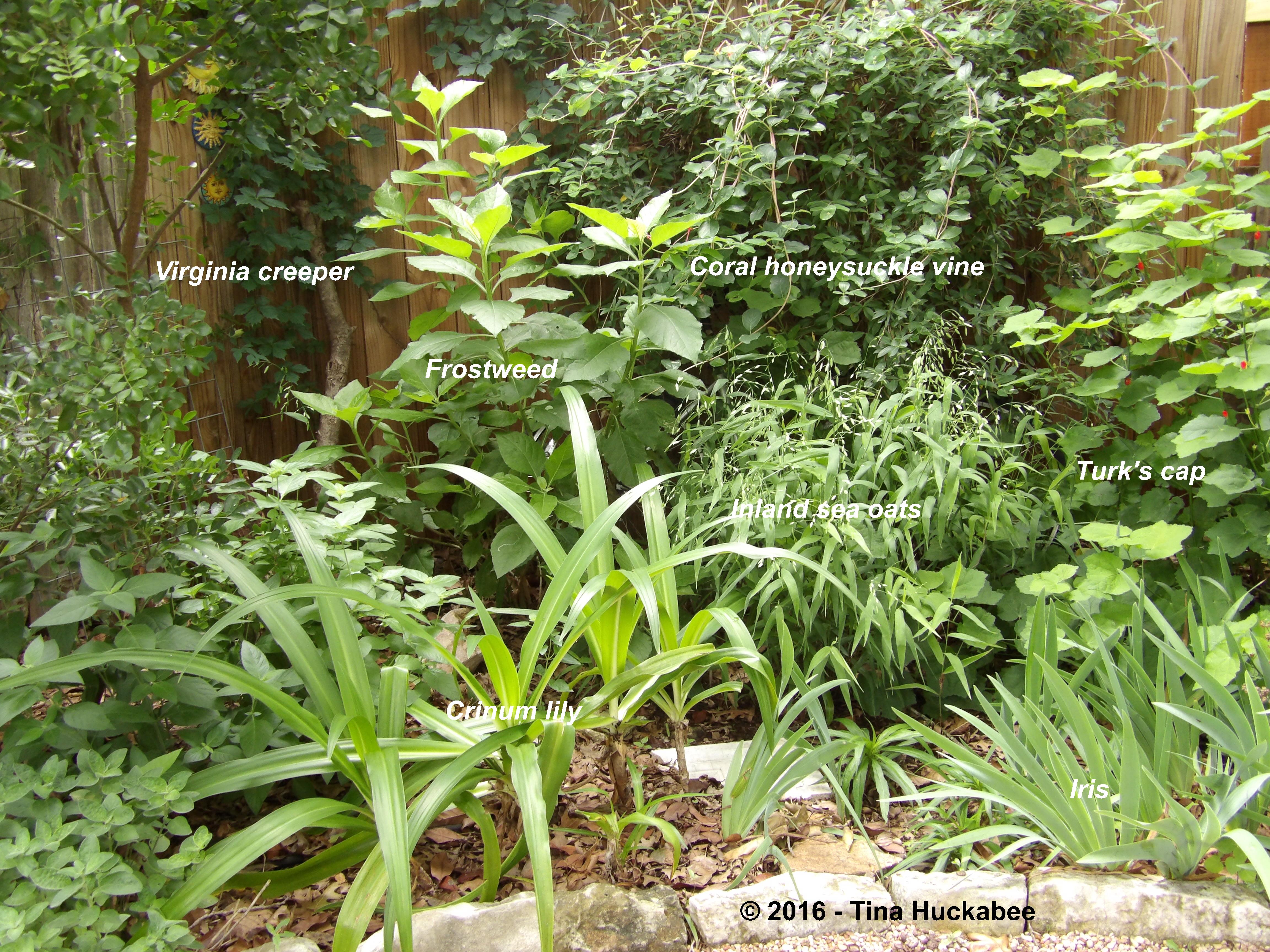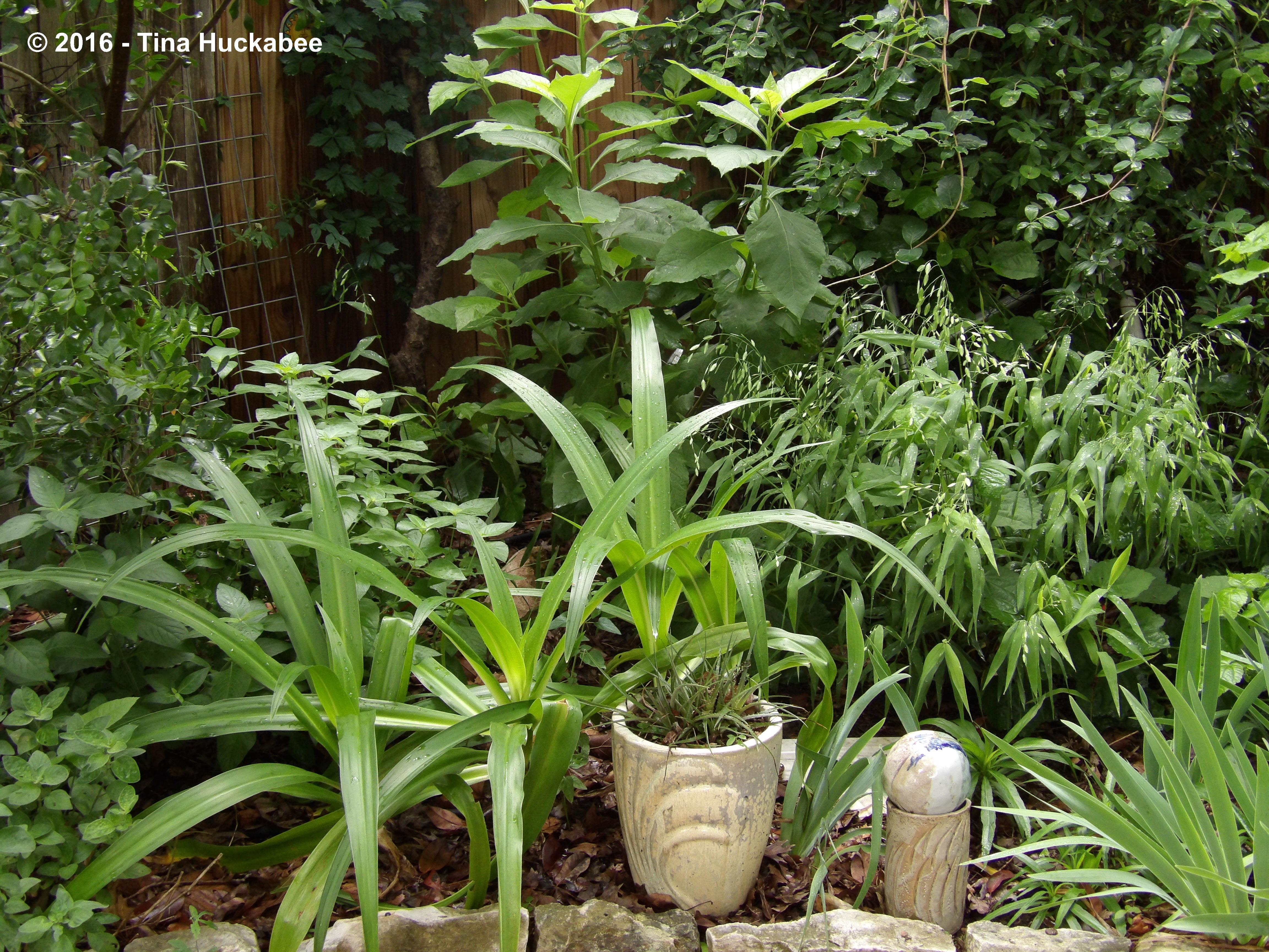 Behind the Frostweed, a generous bird or mammal planted a Virginia creeper, Parthenocissus quinquefolia, which is a second vine in this corner section. This specimen doesn’t achieve the stunning fall color that it would were it planted in full sun, but it’s a great addition to the foliage gang of this garden, nonetheless. Fronting this lot, at the bottom-left, are a collection of unknown Crinum lilies (from my parents’ garden) and Iris plants at the right. The Crinums rarely bloom; regardless, I love them for the foliage. The Iris are reliable spring bloomers.