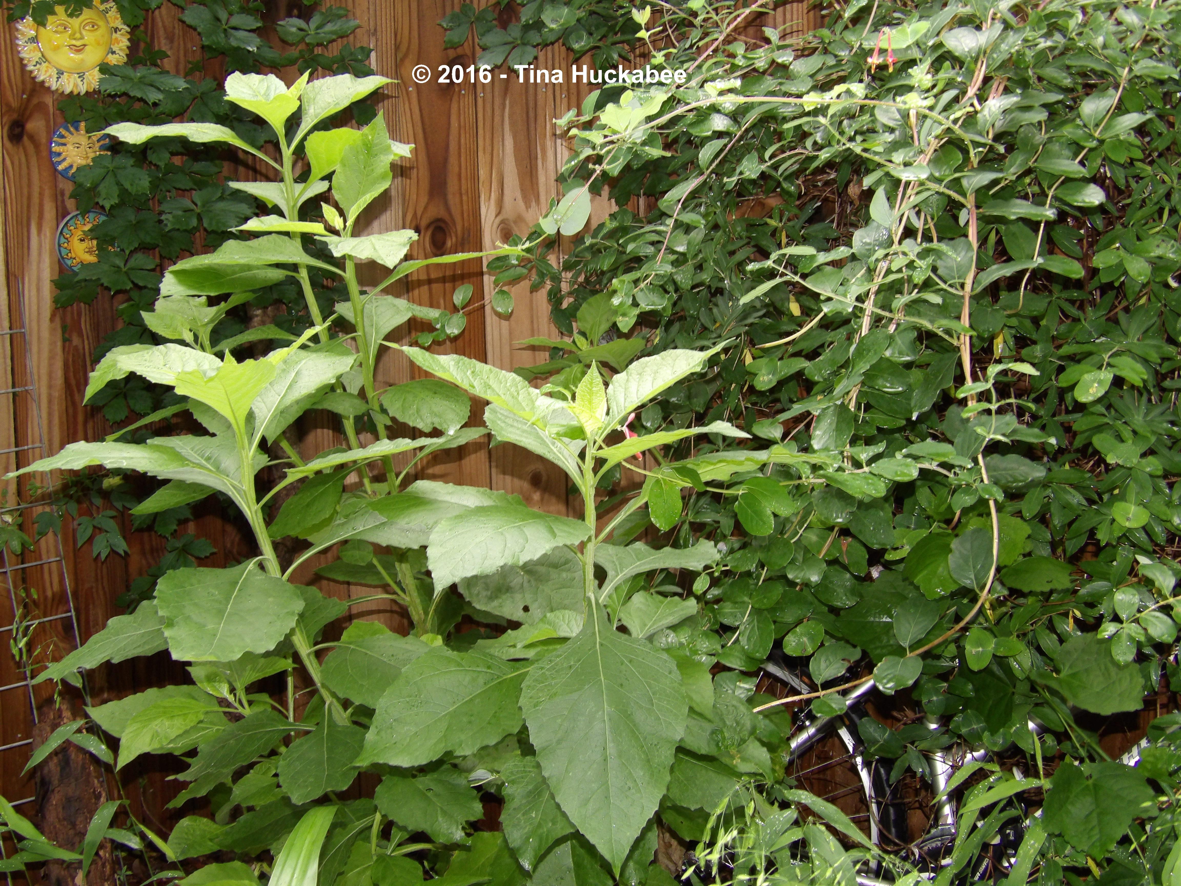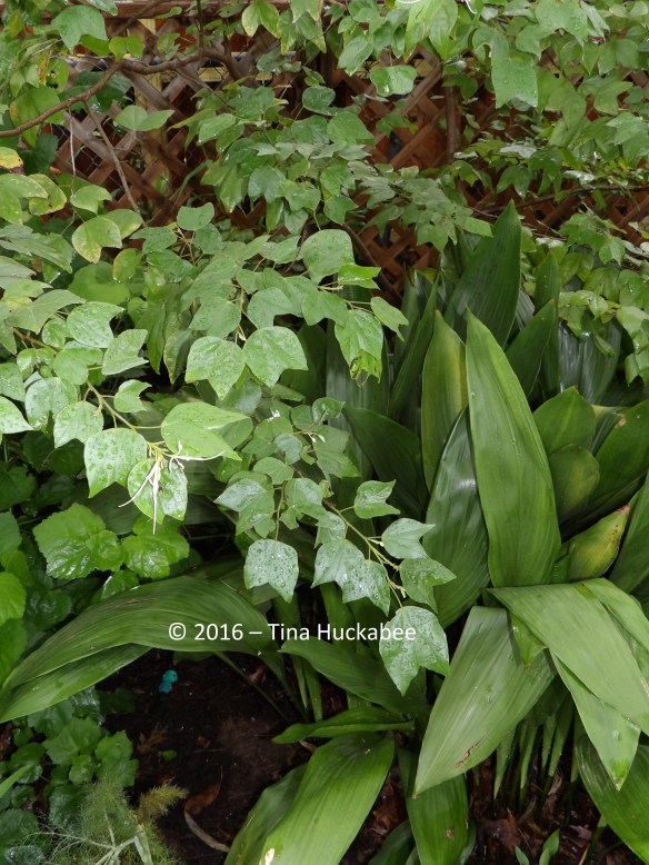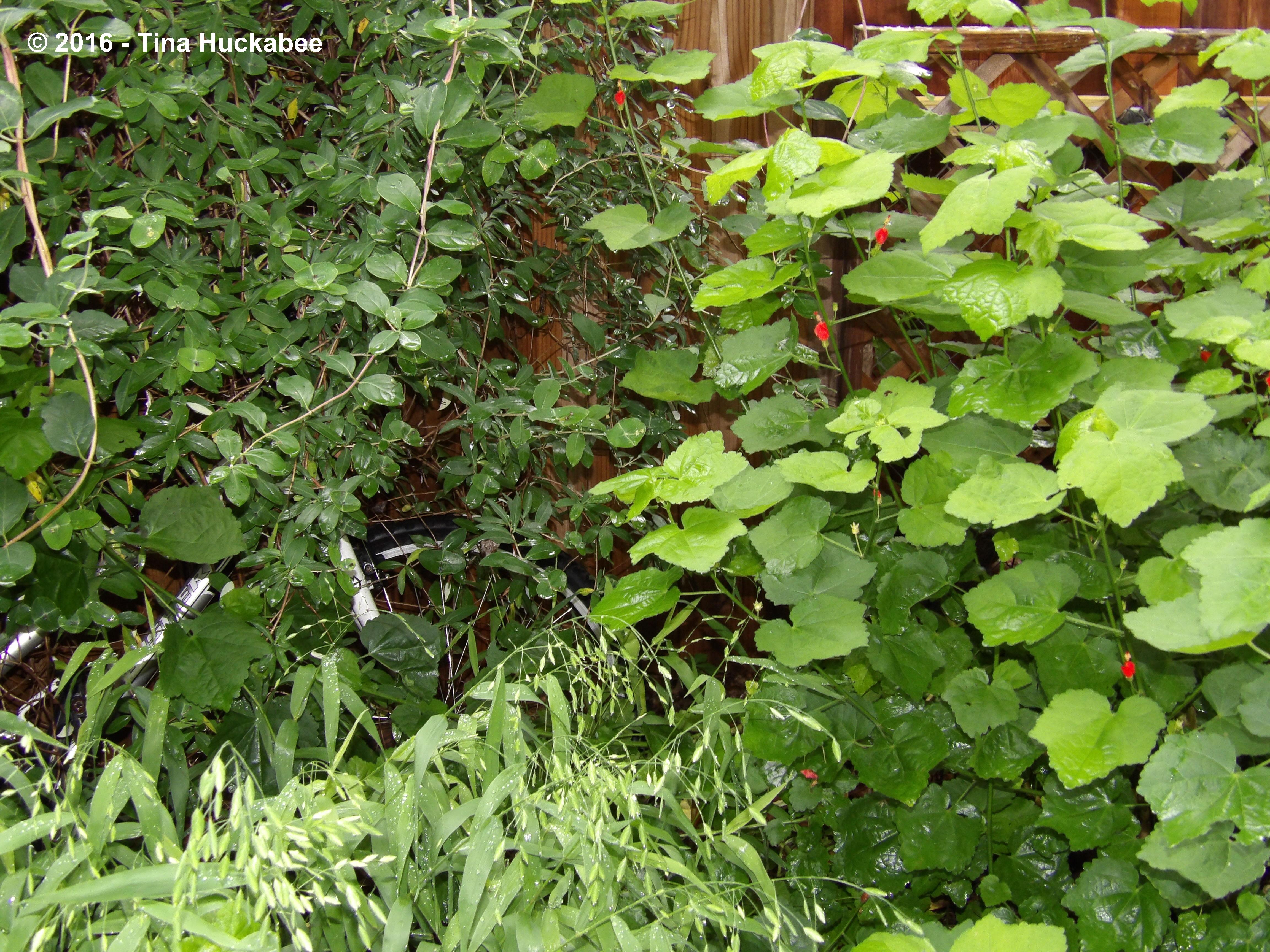 Behind the Frostweed, a generous bird or mammal planted a Virginia creeper, Parthenocissus quinquefolia, which is a second vine in this corner section. This specimen doesn’t achieve the stunning fall color that it would were it planted in full sun, but it’s a great addition to the foliage gang of this garden, nonetheless. Fronting this lot, at the bottom-left, are a collection of unknown Crinum lilies (from my parents’ garden) and Iris plants at the right. The Crinums rarely bloom; regardless, I love them for the foliage. The Iris are reliable spring bloomers.