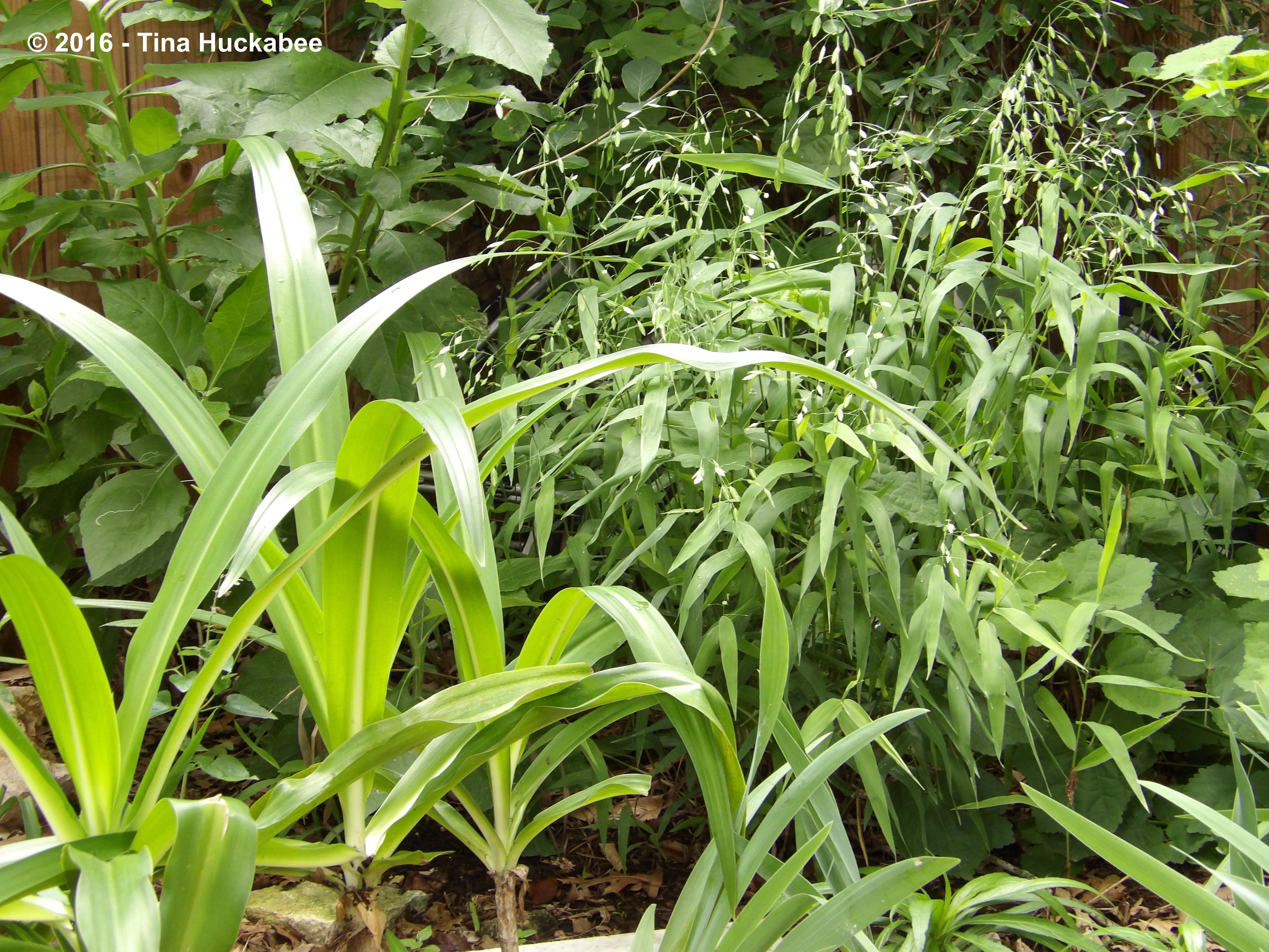 I like the juxtaposition of the various round-to-oblong perennial foliage combined with the jaunty straps of the Crinums.