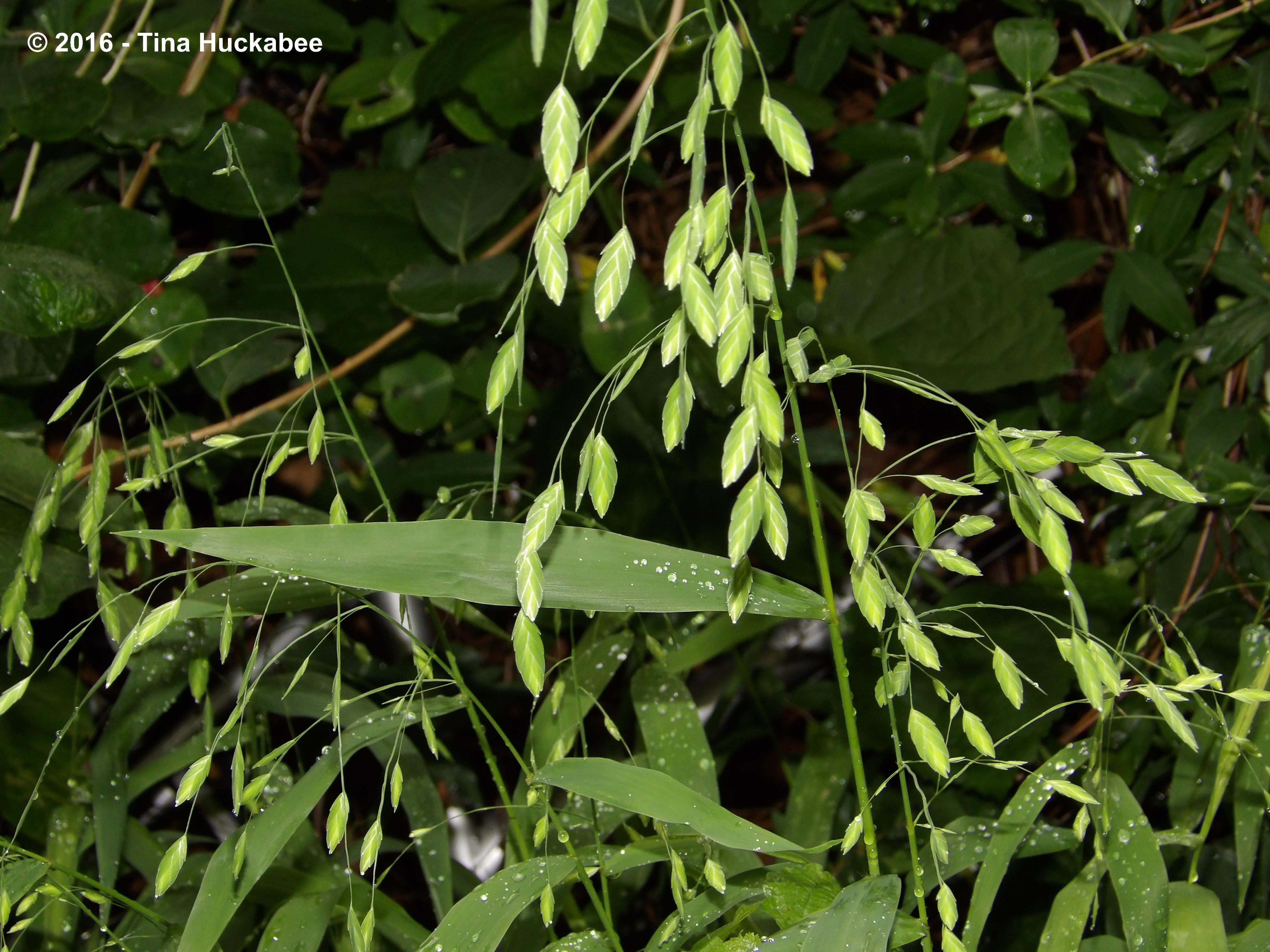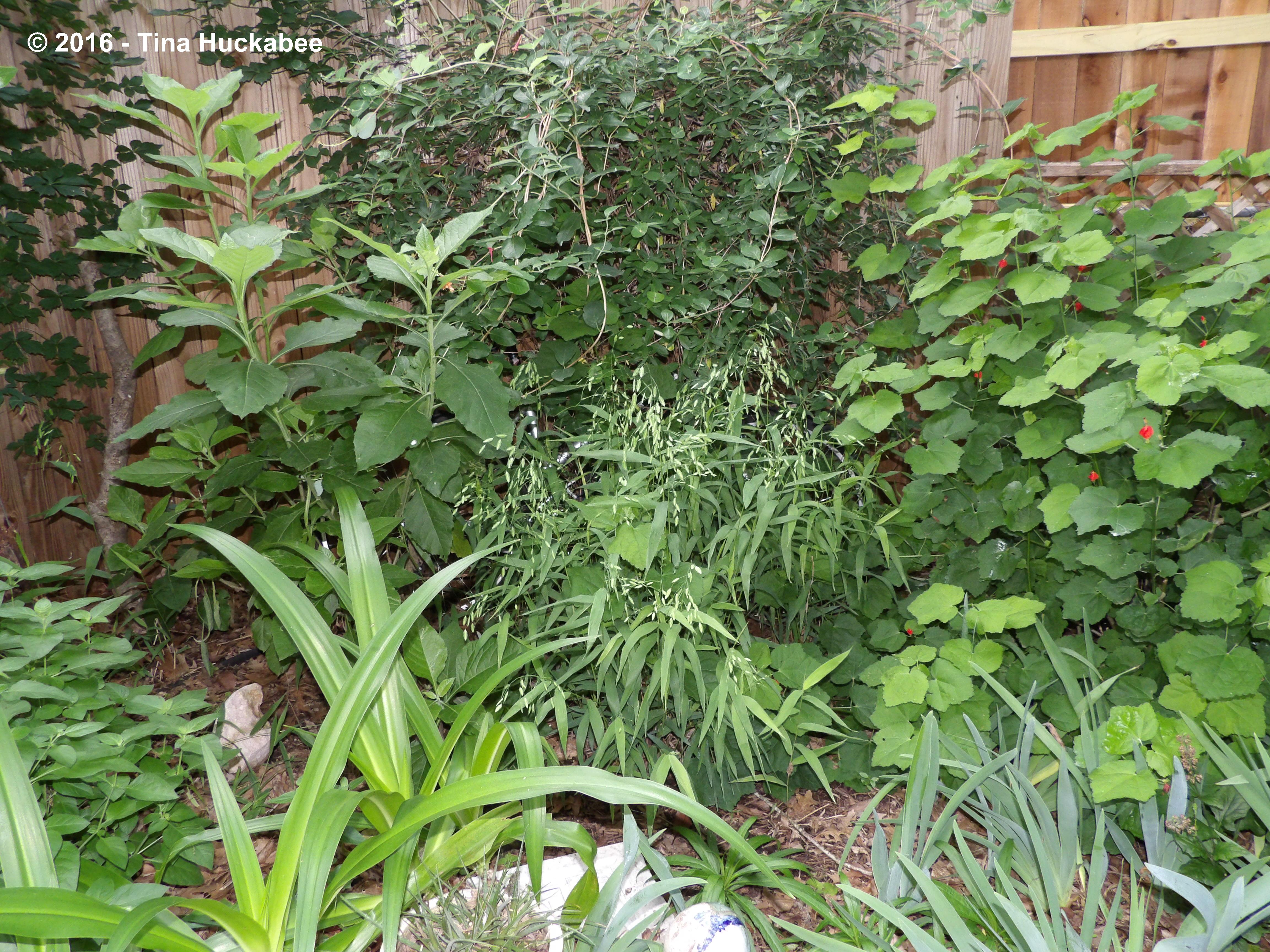 Fronting the honeysuckle are several clumps of Inland sea oats, Chasmanthium latifolium, a grass which is native to a large area of the U.S. The “oats” are developing, and growing,