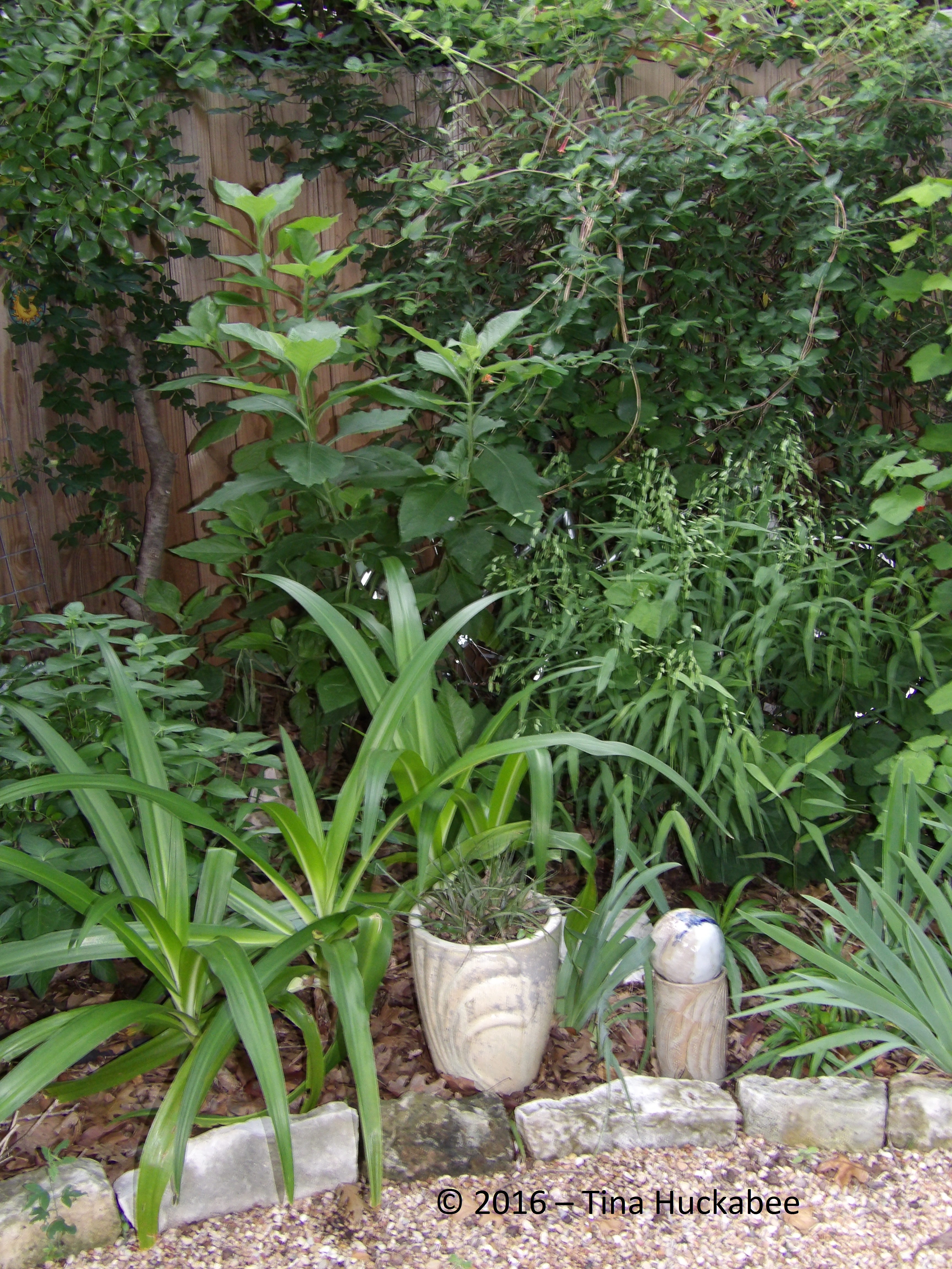This is not the entirety of the corner garden and perhaps I’ll profile the remainder during another GBFD. Most of these plants bloom at some point, but the various greens and leaf structures are what interest and please me most about this garden. My one regret is that there isn’t a large variety of foliage-colorful, drought-tolerant plants, appropriate for shade and that provide something for wildlife, that I can use. I guess it’s a tall order: a dry-shade garden which can take the Texas-tough climate conditions that also feeds/protects wildlife and that showcases more-than-green foliage. Oh yeah, I’d also prefer to use as many native Texas/North American plants as possible.