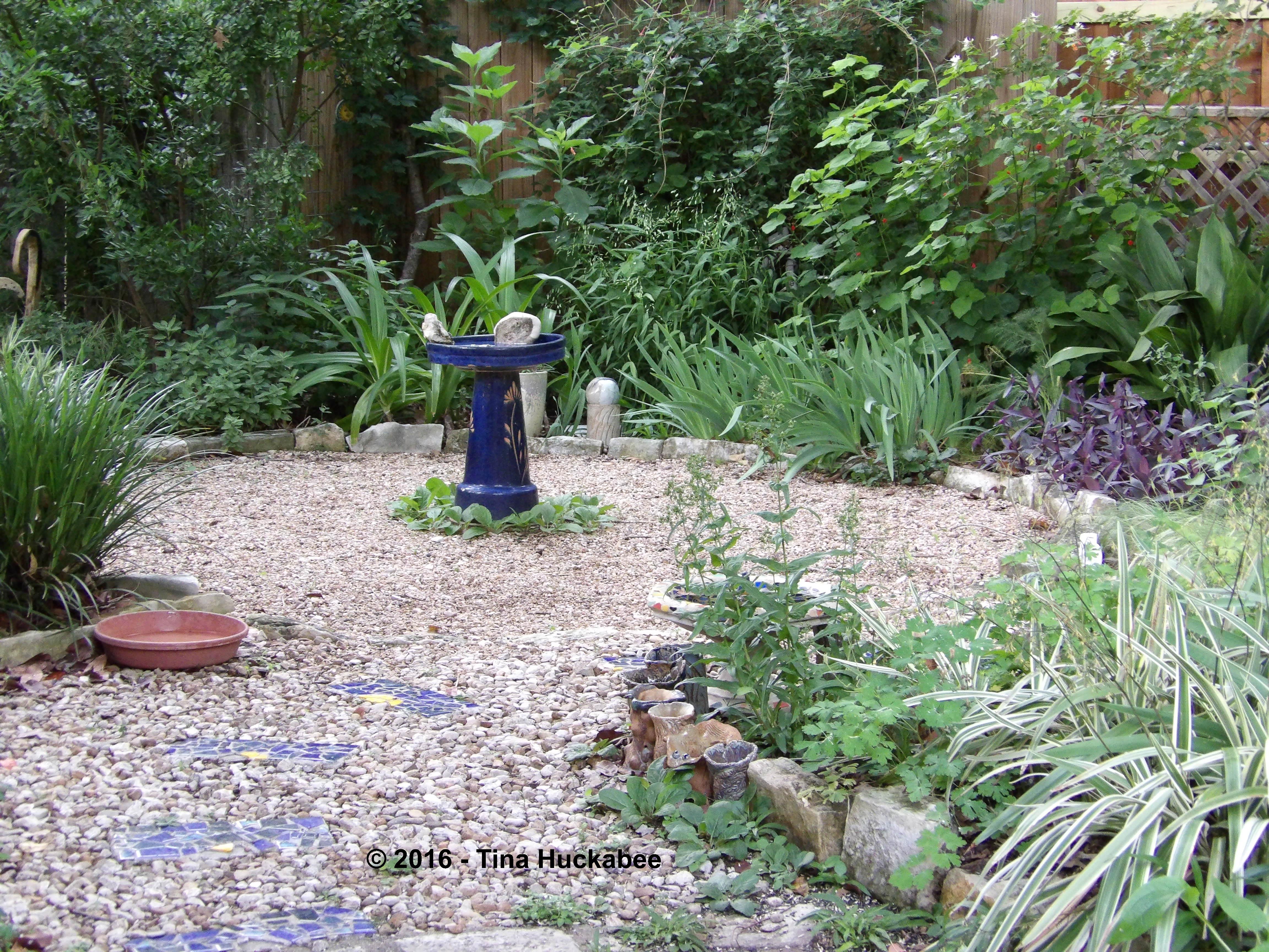 A variety of different plants envelop the negative space that is the pea gravel walk with the blue bird bath at its center. For this post, I’ll focus on certain sections–the center corner and the adjacent left and right sections.