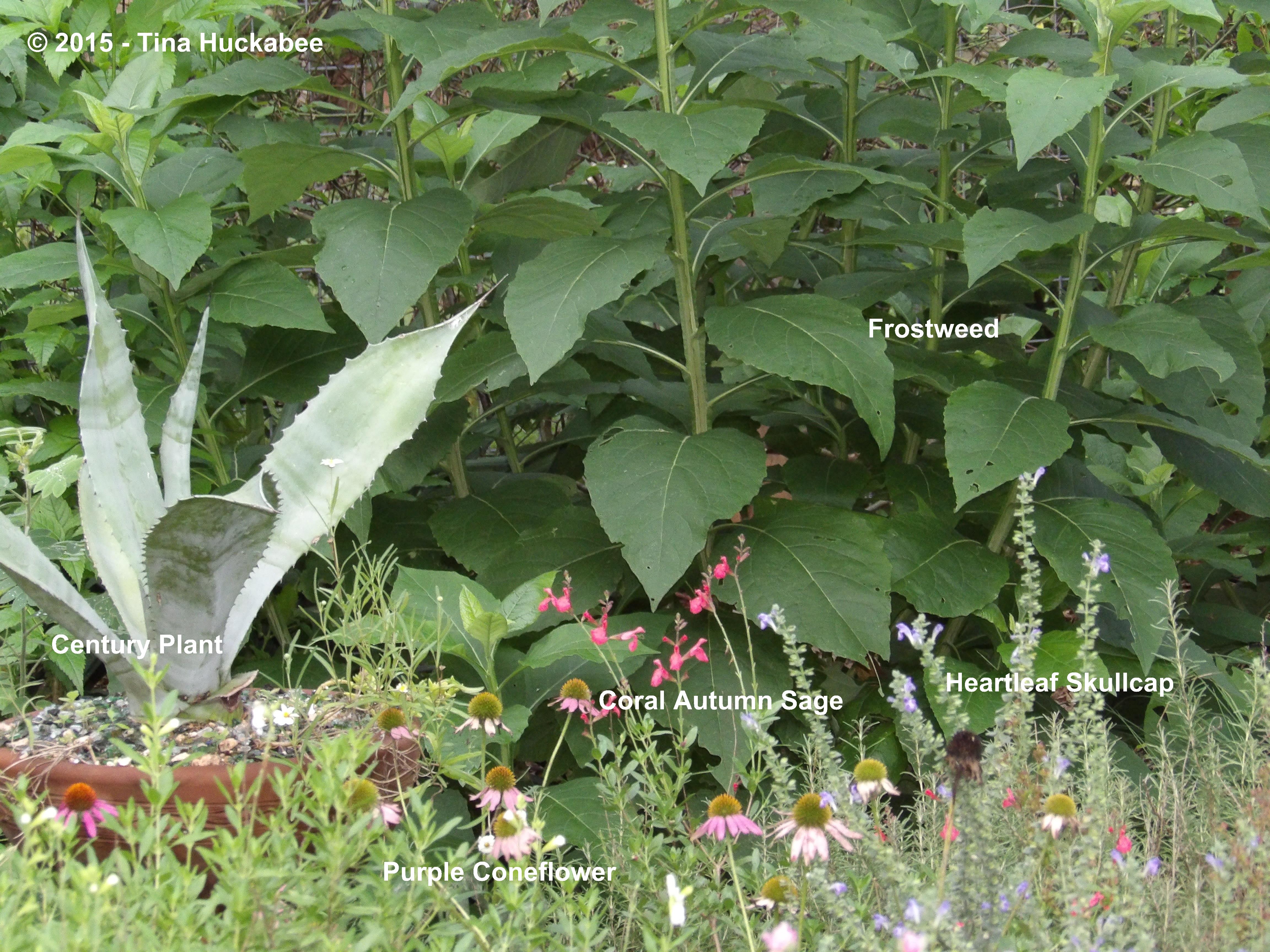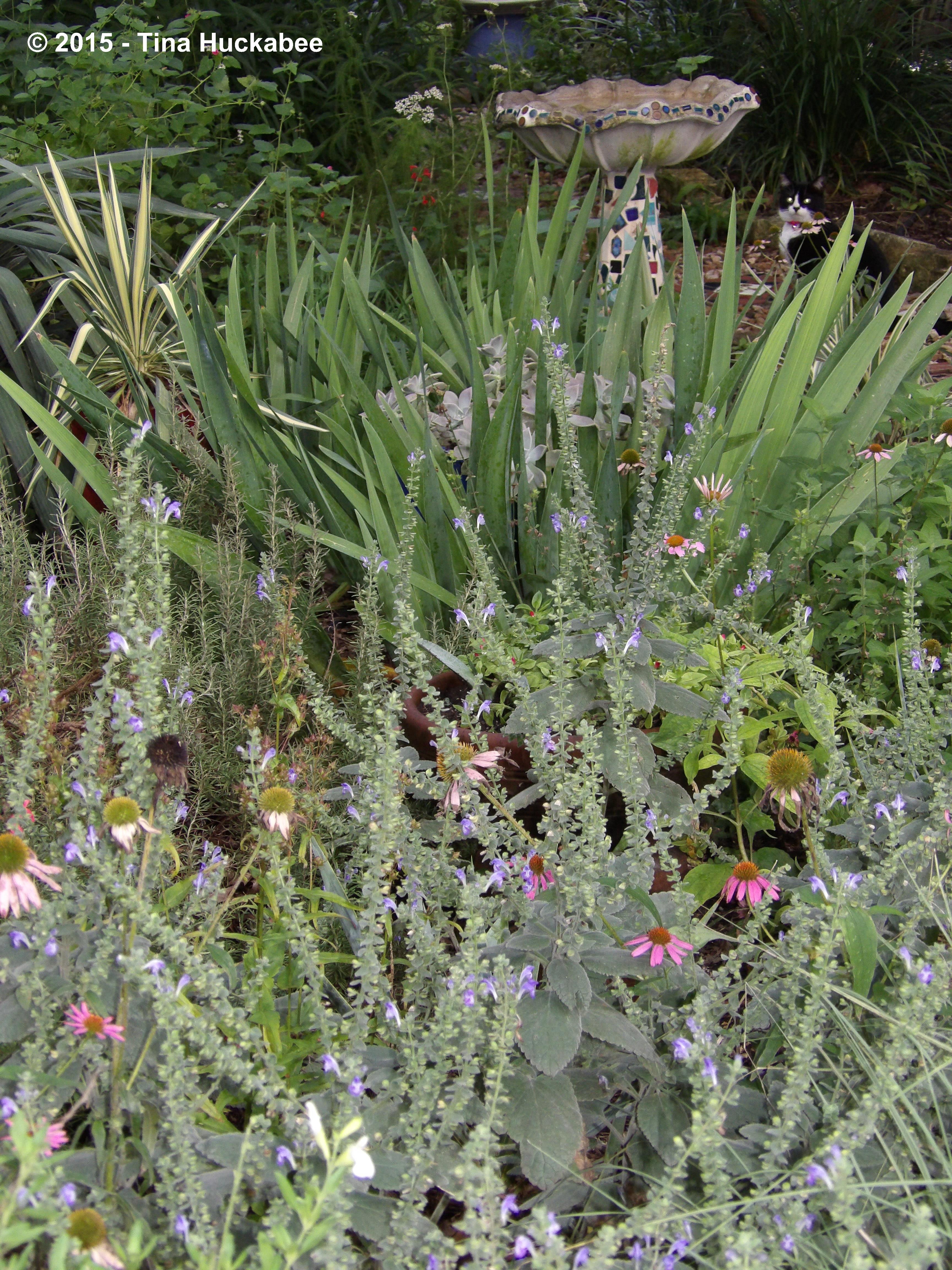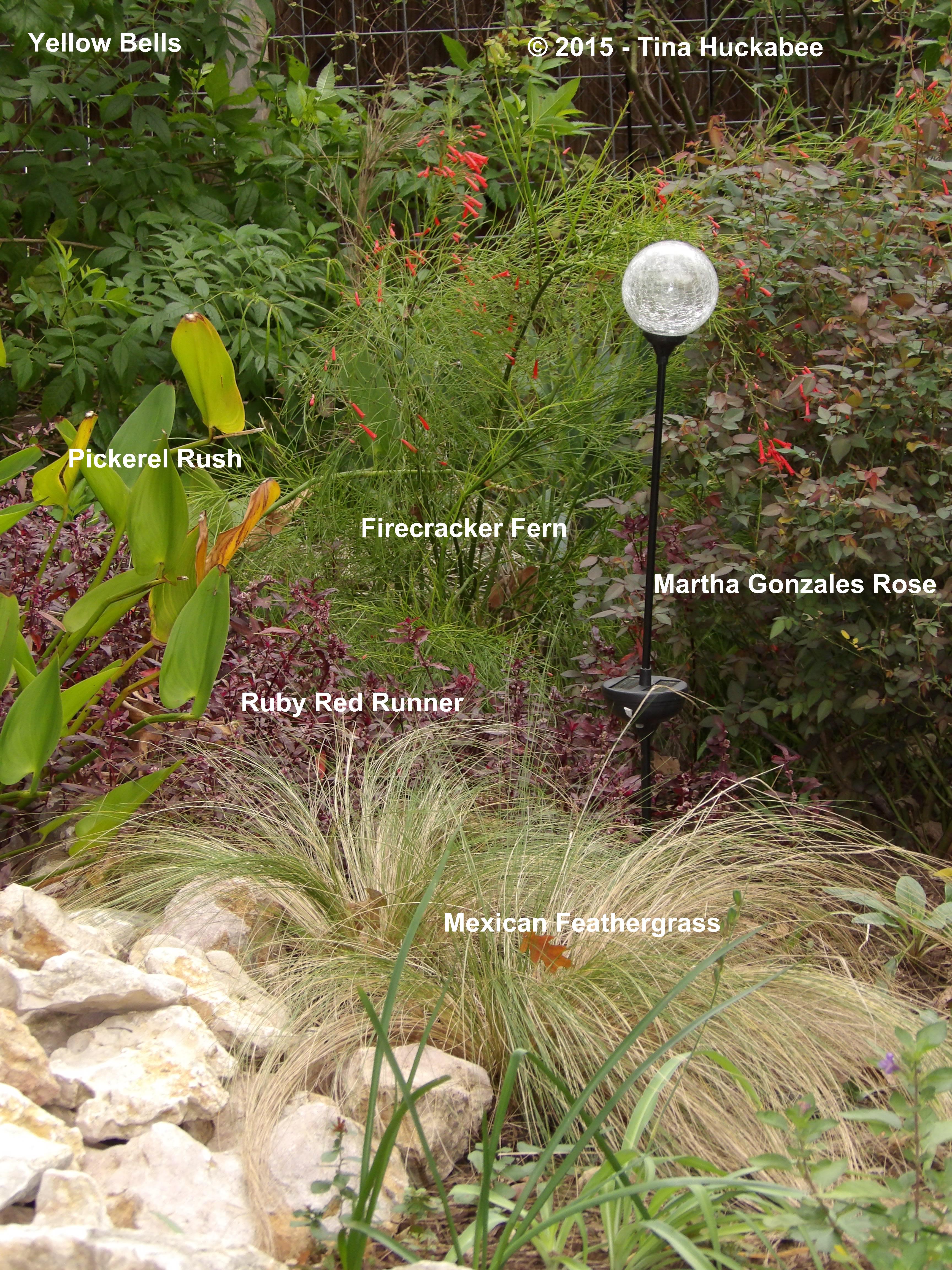 A wider view of this small section of my garden profiles a nice combination of colorful and varying textured autumn foliage. Assuming that there is a hard freeze at some point, Mexican Feathergrass, Martha Gonzales Rose and Softleaf Yucca (not visible in this shot) will be the evergreen structural specimens left to decorate this particular spot during our relatively short winter.