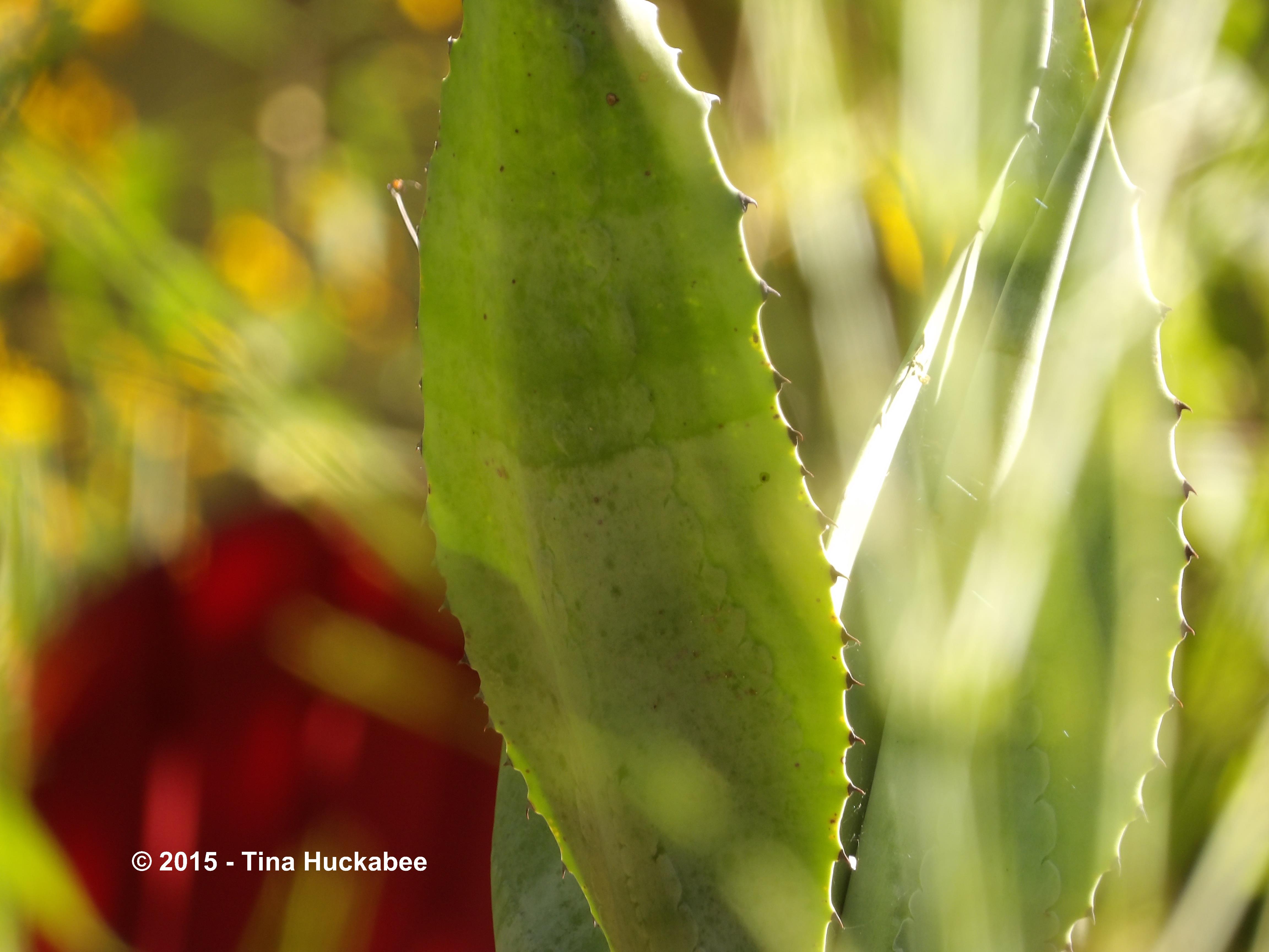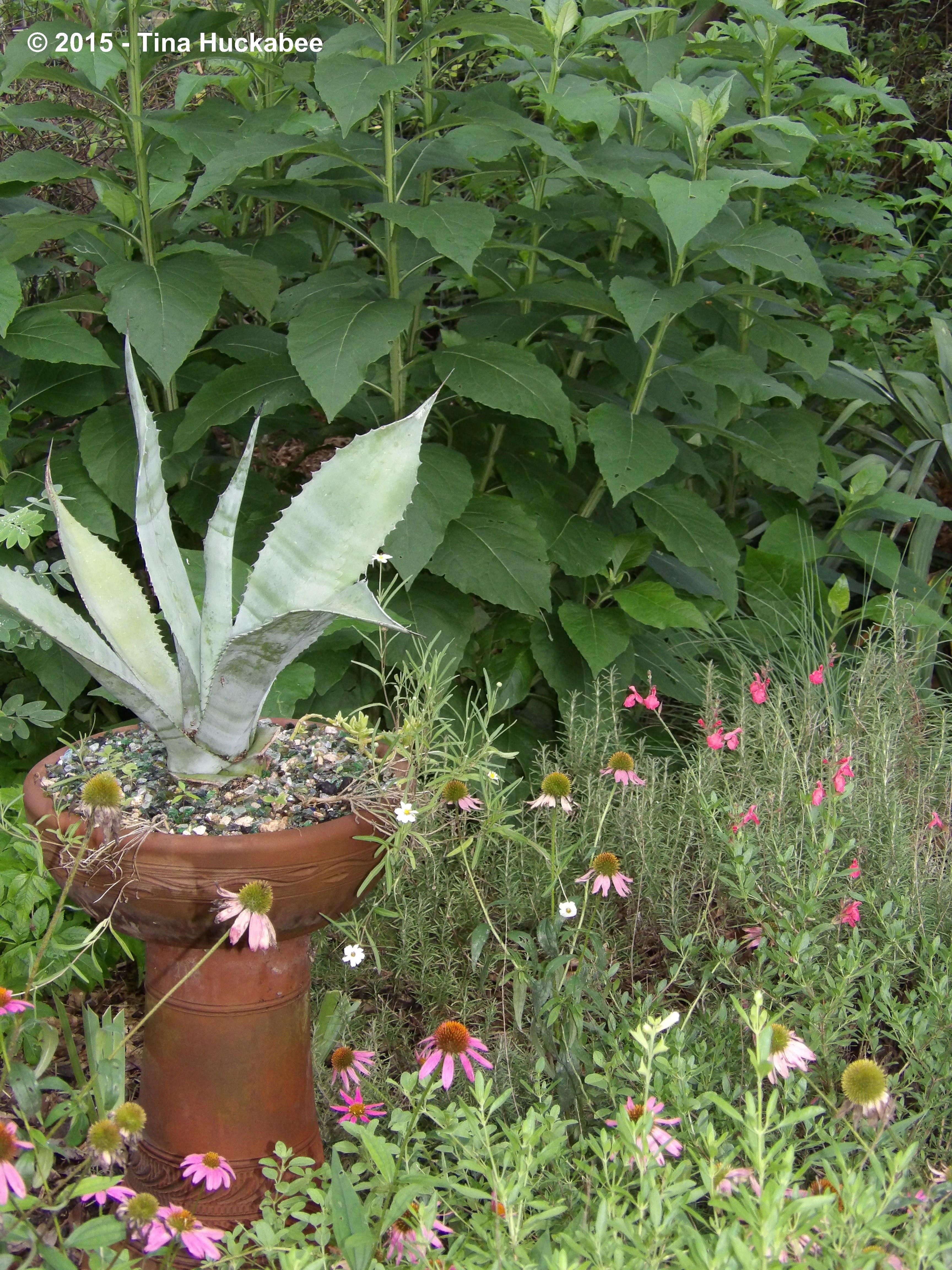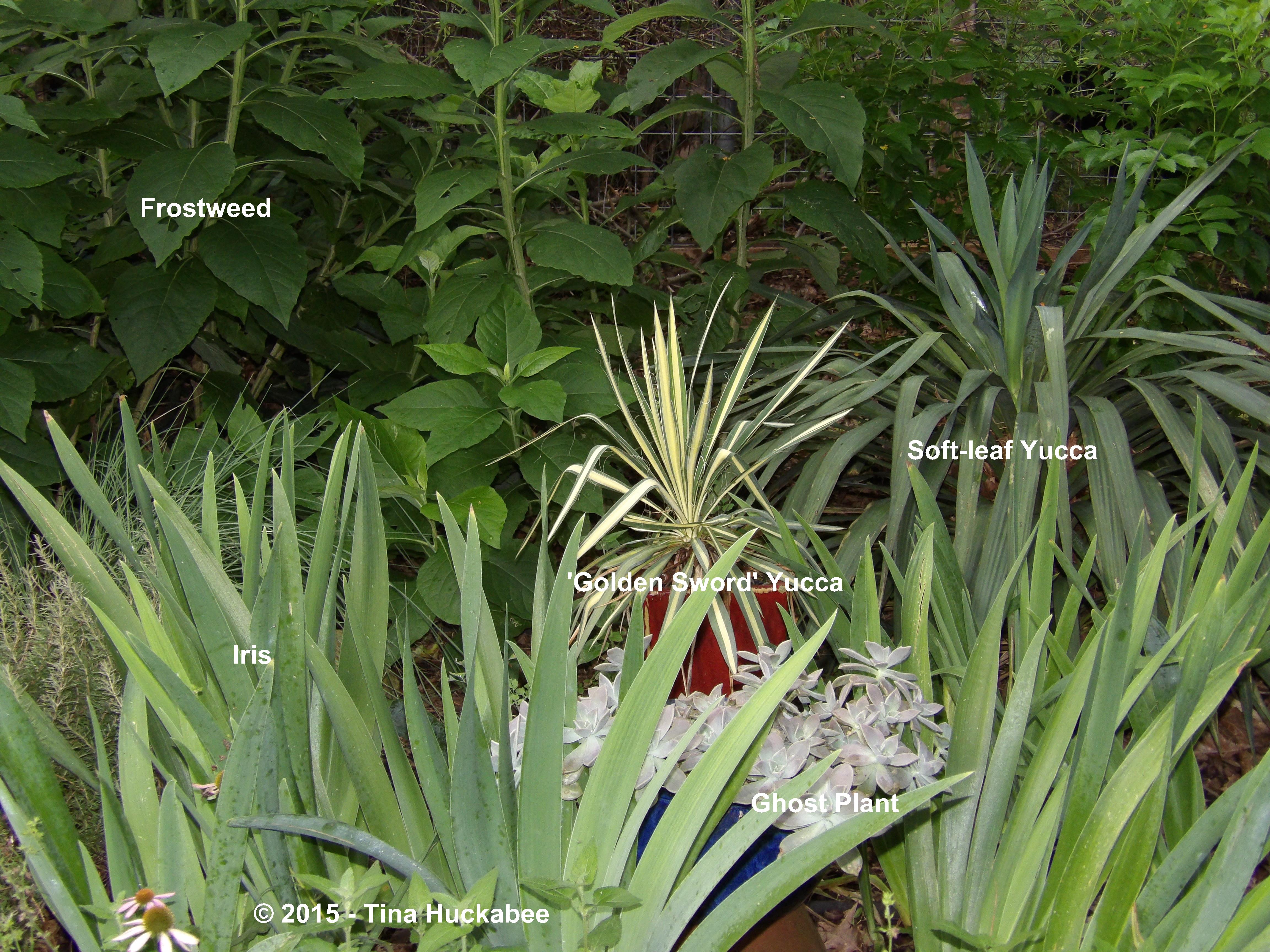 Behind the Firecracker Fern, stands the stalwart Softleaf Yucca, Yucca recurvifolia.