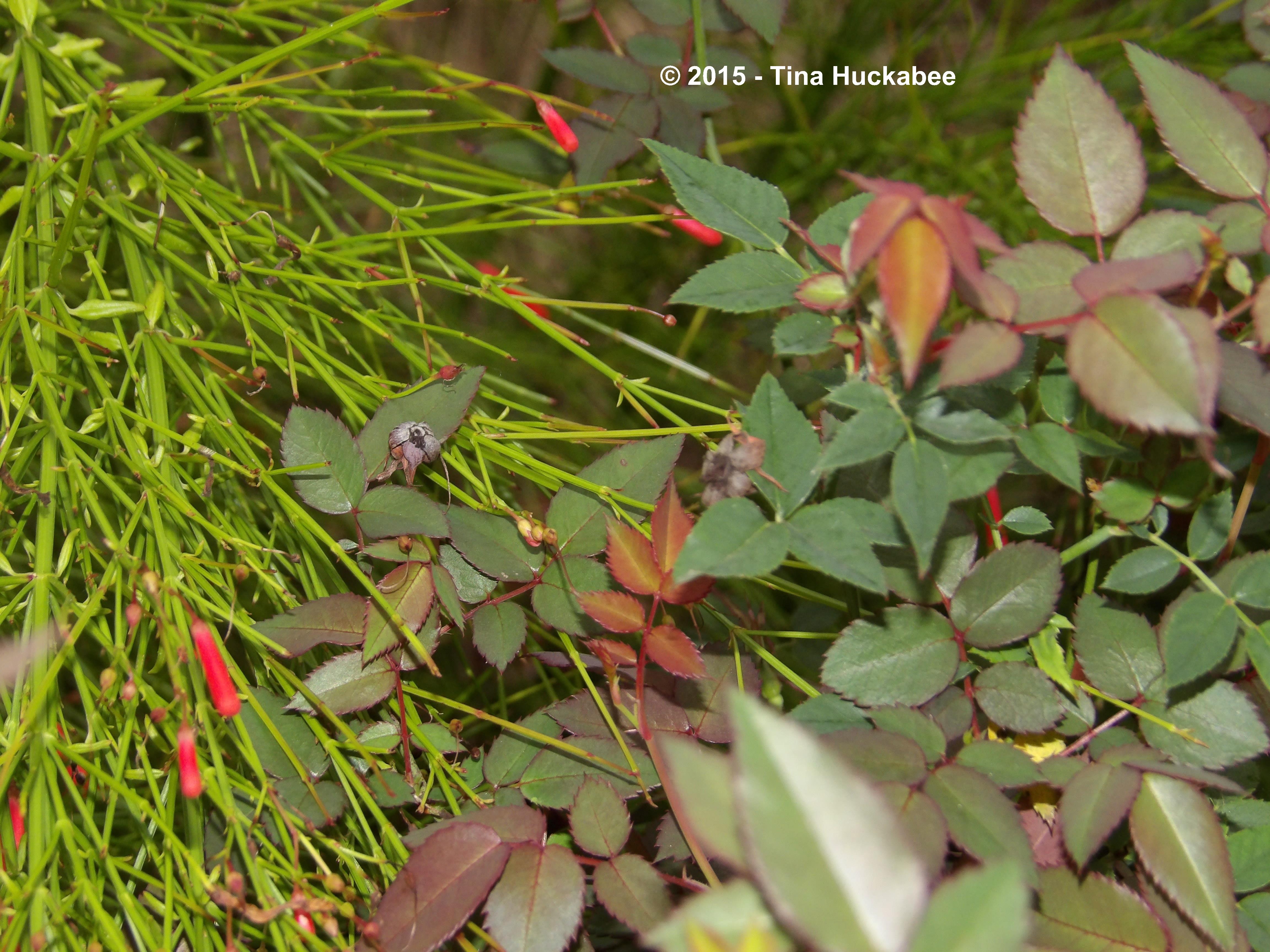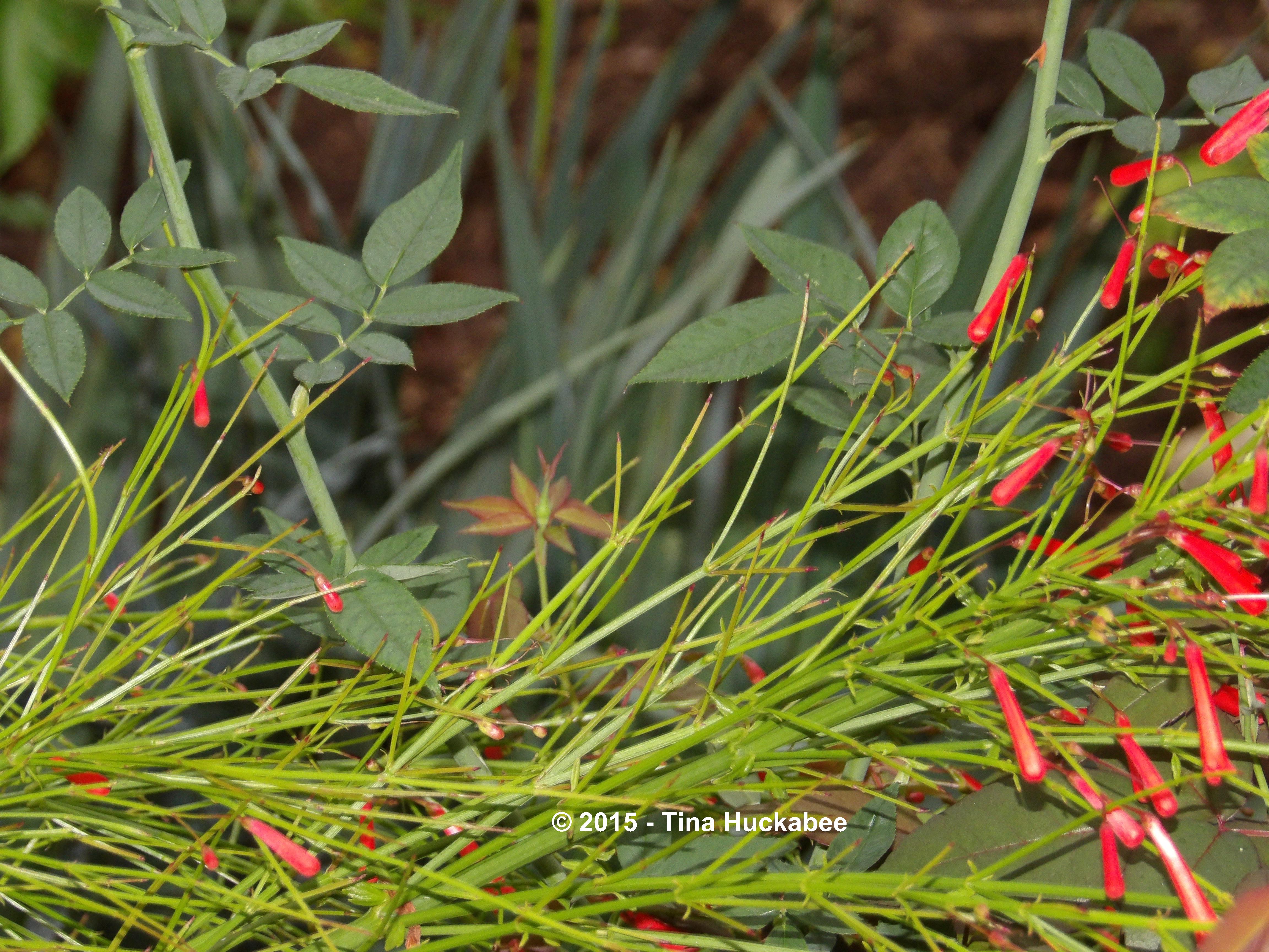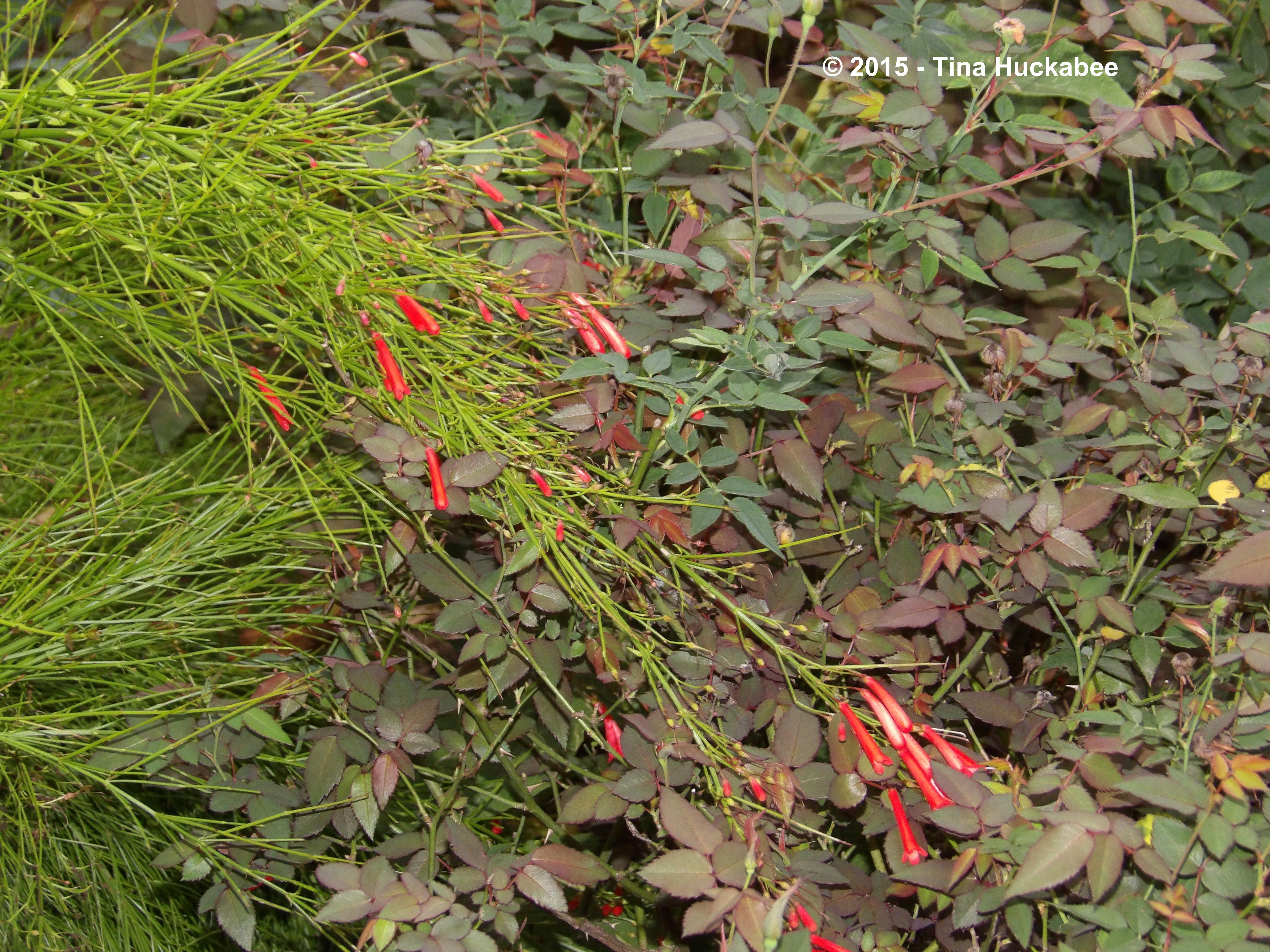 The Martha Gonzales Rose also sports a similar burgundy and green foliage dressing. It’s photobombed here by the long-blooming and fine-foliaged Firecracker Fern, Russelia equisetiformis.
