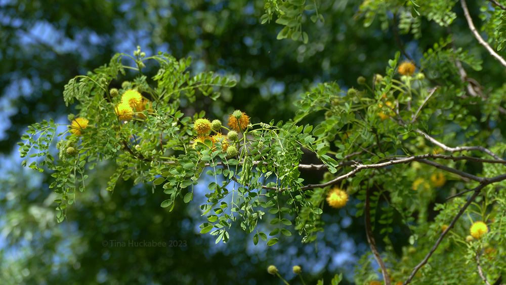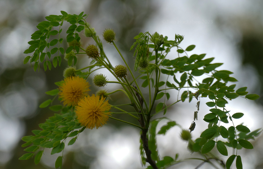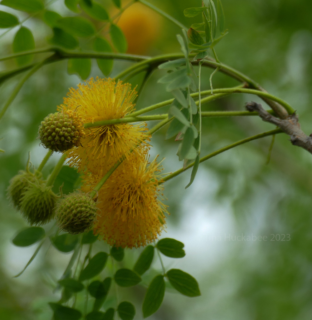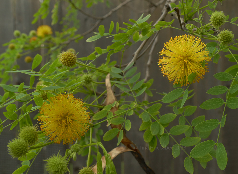 Spring is progressing apace, new foliage and flowers appearing, posthaste. My diverse garden community offers varied, interesting blooms, each with their own timeline for appearing, each with their own story and role in this ecosystem. Puffy and playful, the fuzzy spring looms of the Goldenball Leadtree, Leucaena retusa, are glorious golden decorations in a shady part of my garden