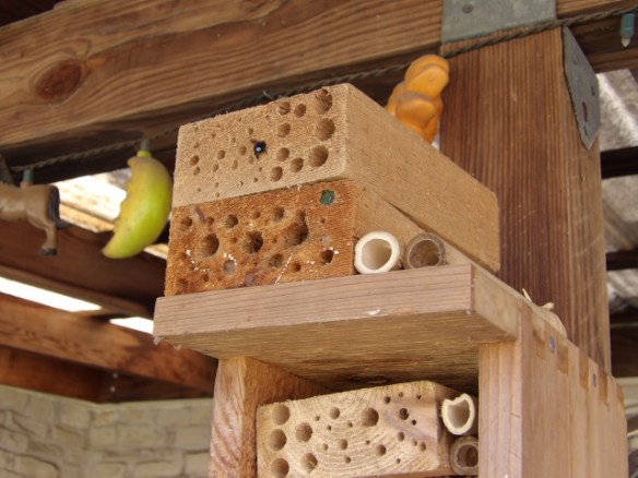 With as long a screw that I could find in our garage, I cleaned out those drilled holes where it was obvious that a bee had emerged, so that it’s available for the next generation. I couldn’t quite reach the end of the drilled holes in some nesting spaces, but cleared many spots. I also added a few more cut bamboo pieces and drilled wood blocks to the boxes.