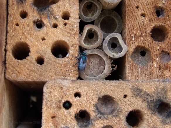 It takes a full year for these blue beauties to “cook till done” but it’s time well-spent. Currently, every time I walk by either of my two insect hotels, there is a flurry of shiny blue activity as the buzzers have mated and are bringing in material to secure their babies’ future.