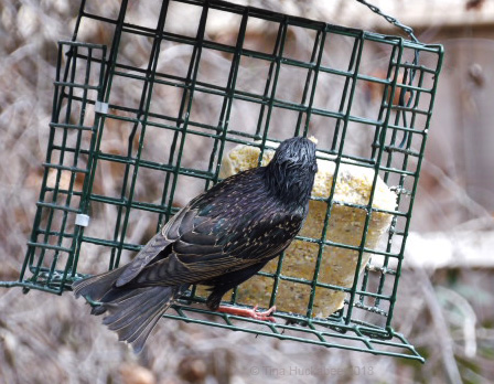 Starlings show up in late February and are bullies at the suet feeder. I usually stash away the suet when I see them congregating and chasing off the local songbirds, because a group of Starlings can finish a suet block in an hour, if allowed the opportunity. I have noticed that they only appear in the mornings, so I hang out the suet in the afternoons once they’re gone. This year, there haven’t been as many Starlings, for which I’m grateful. They are joyous bathers and make great use of my birdbaths and the bog area of the pond.