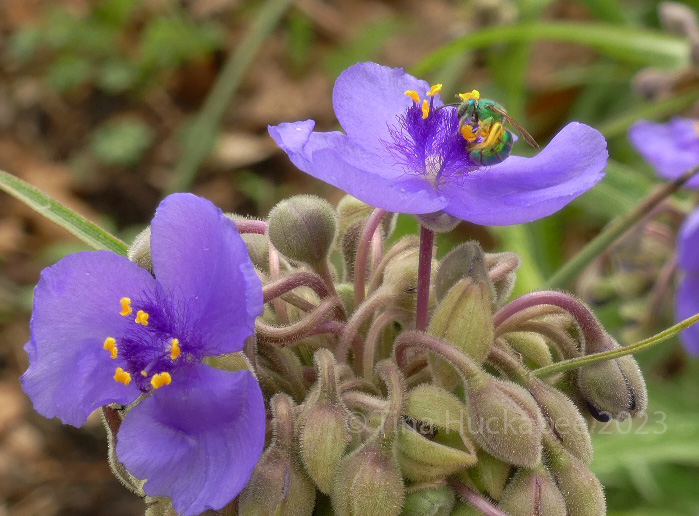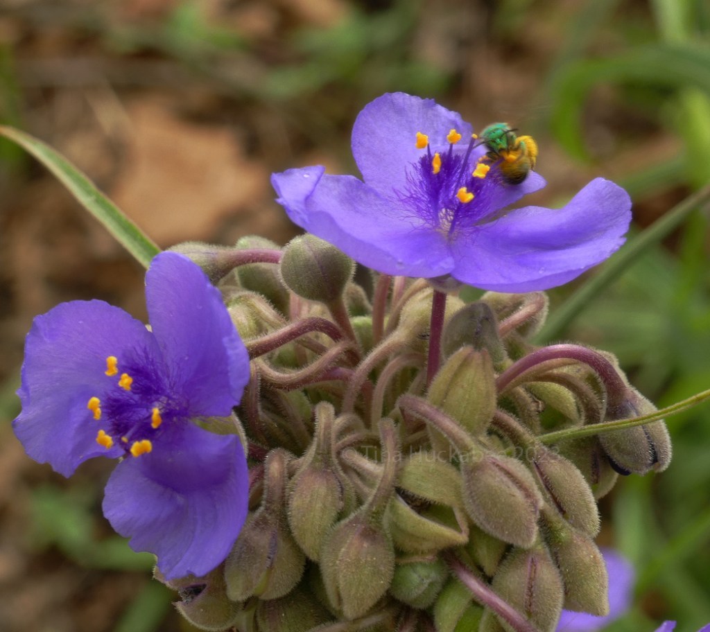 This type of metallic green bee belongs to the Halictidae family of bees and are common in gardens with a variety of flowers for nectaring and pollen gathering. Bees who forage from a wide array of plants are polylectic. As they visit flowers, females gather pollen on their legs (which you can see in the photos) for their nests. This one is working the blooms of Giant Spiderwort, Tradescantia, but I’ve seen her kind on other flowers.