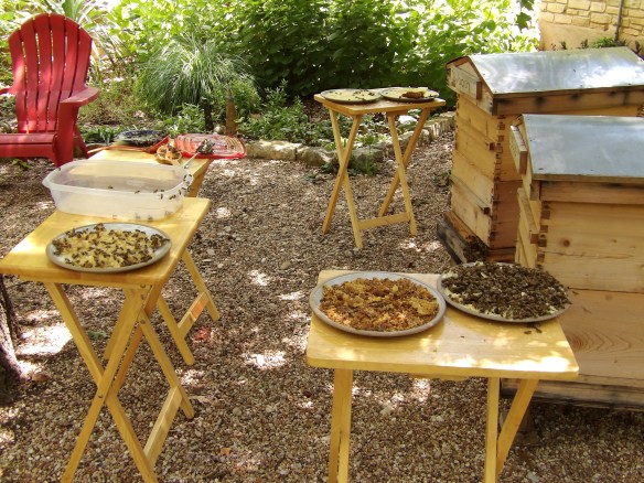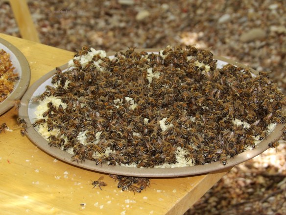 Yum! After crushing the comb and dripping the honey into jars, I always set out the crushed comb for the bees’ slurping pleasure. There’s plenty of honey that I can’t get to and I don’t want it wasted. The honeybees should have it as because they’re the heroines of honey.
