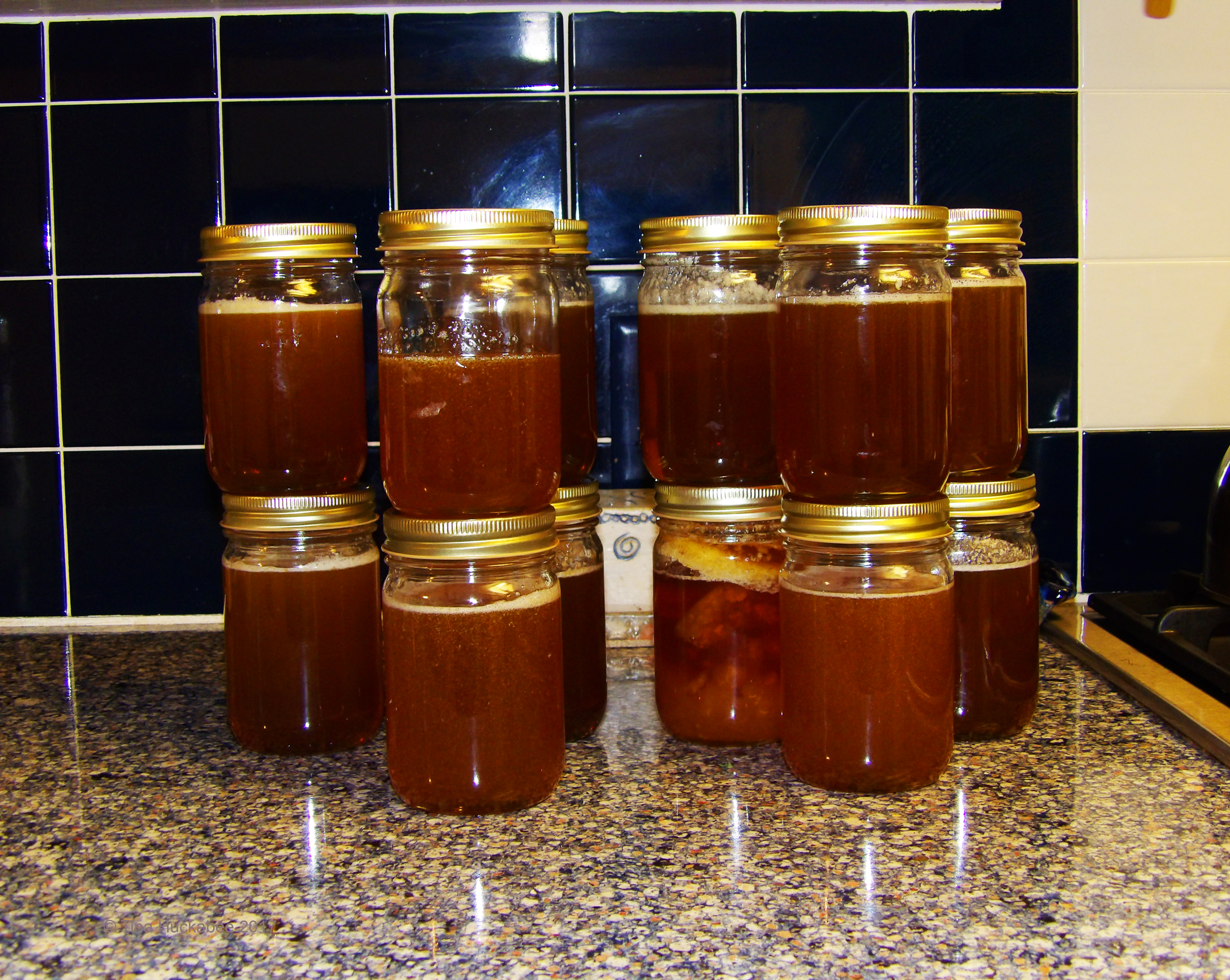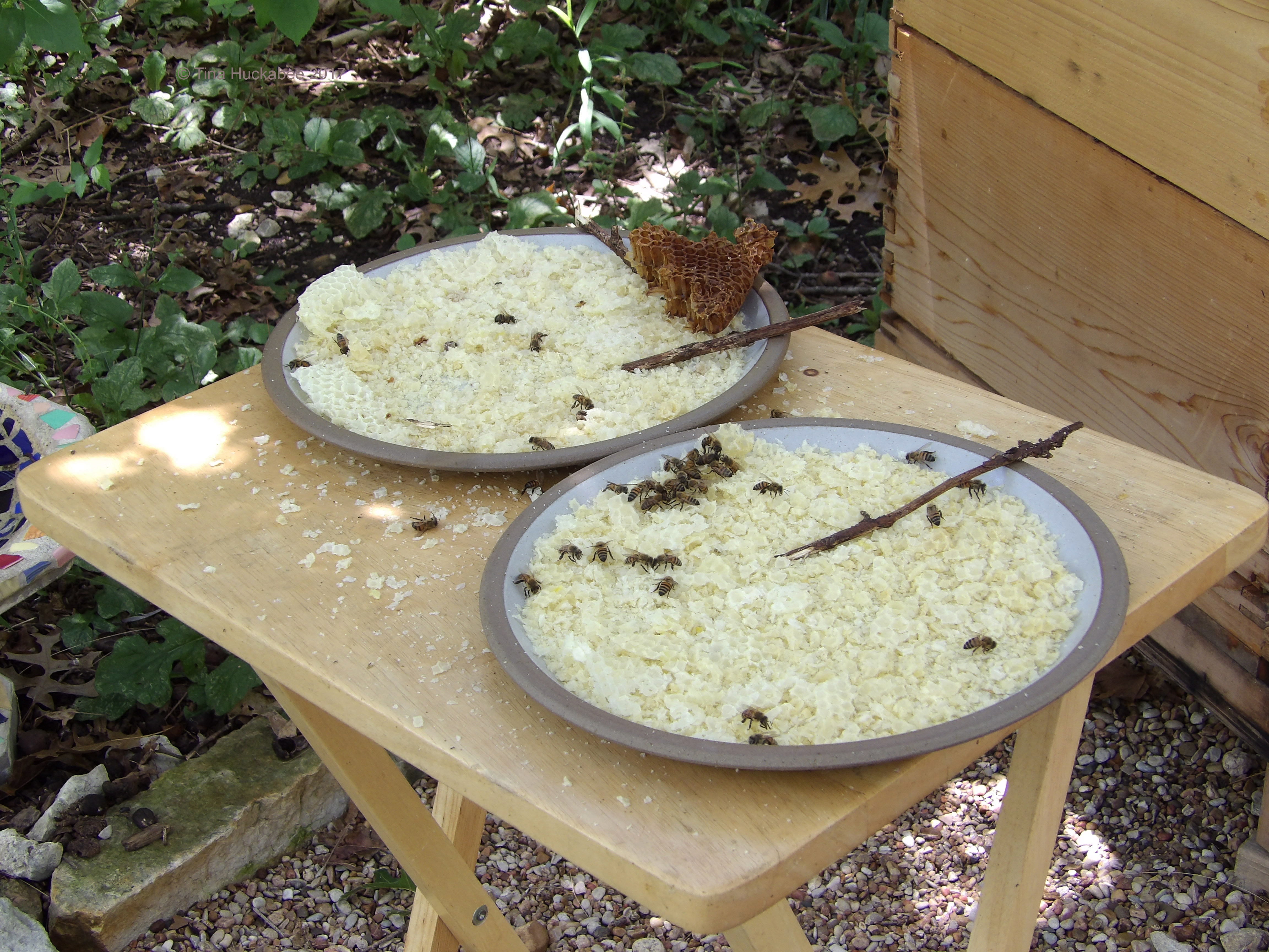 Yum! After crushing the comb and dripping the honey into jars, I always set out the crushed comb for the bees’ slurping pleasure. There’s plenty of honey that I can’t get to and I don’t want it wasted. The honeybees should have it as because they’re the heroines of honey.