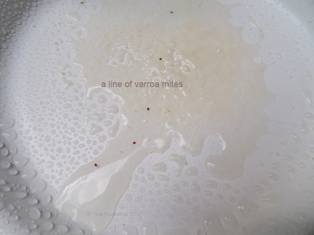 Varroa mites are tiny, oval, and red-brown in color. The powdered sugar on the bees, combined with the shaking of the bottle, sloughs off any varroa attached to bees. We shake the sugar onto a white plate, spritz with water, and count varroa mites.