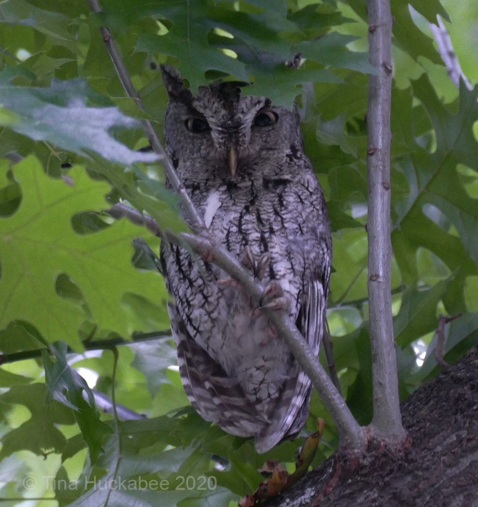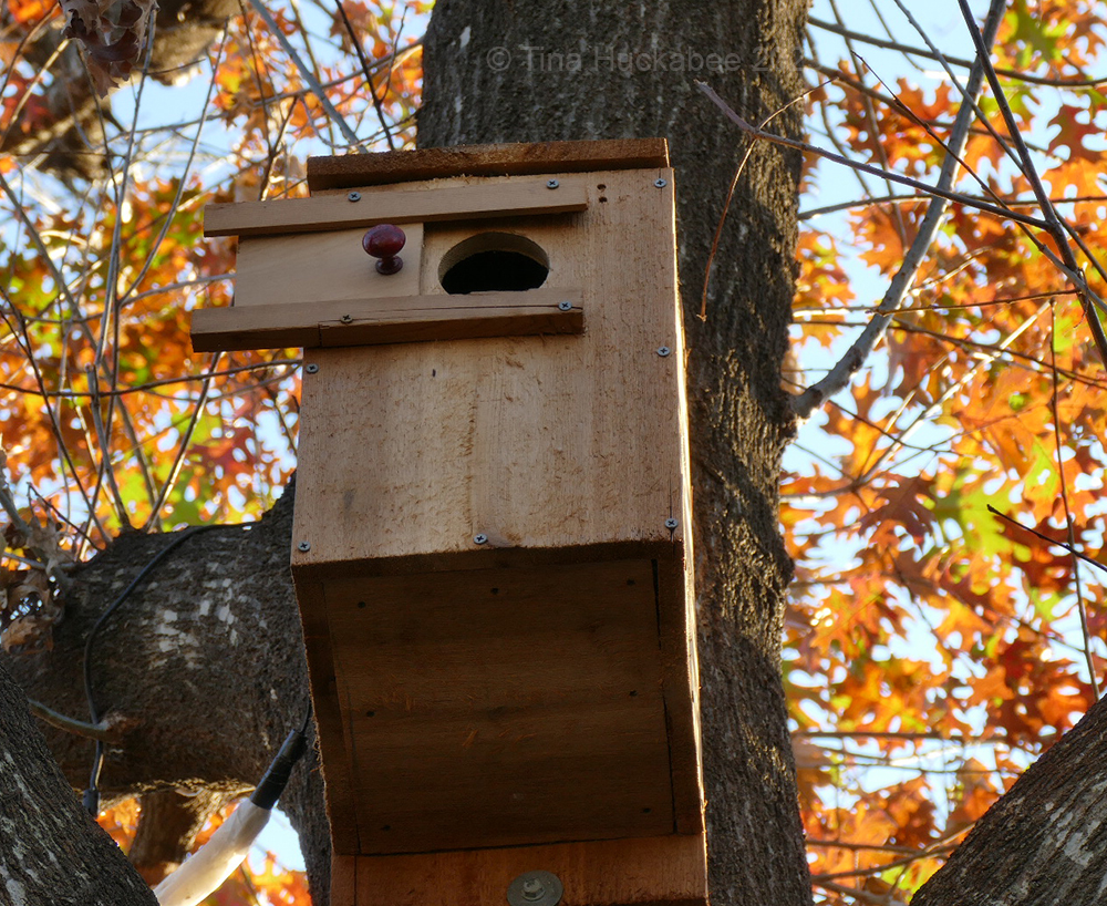 For the last week, in the wee early morning hours, just at sunrise, I’ve witnessed an Eastern Screech Owl, Megascops asio swoop to the box for inspection. She’d perch at the entrance hole, sit a bit, then climb in for a look-see. Usually, she flew back to a neighbor’s tree to spend her day. Today, she climbed in and stayed in the box for the day.