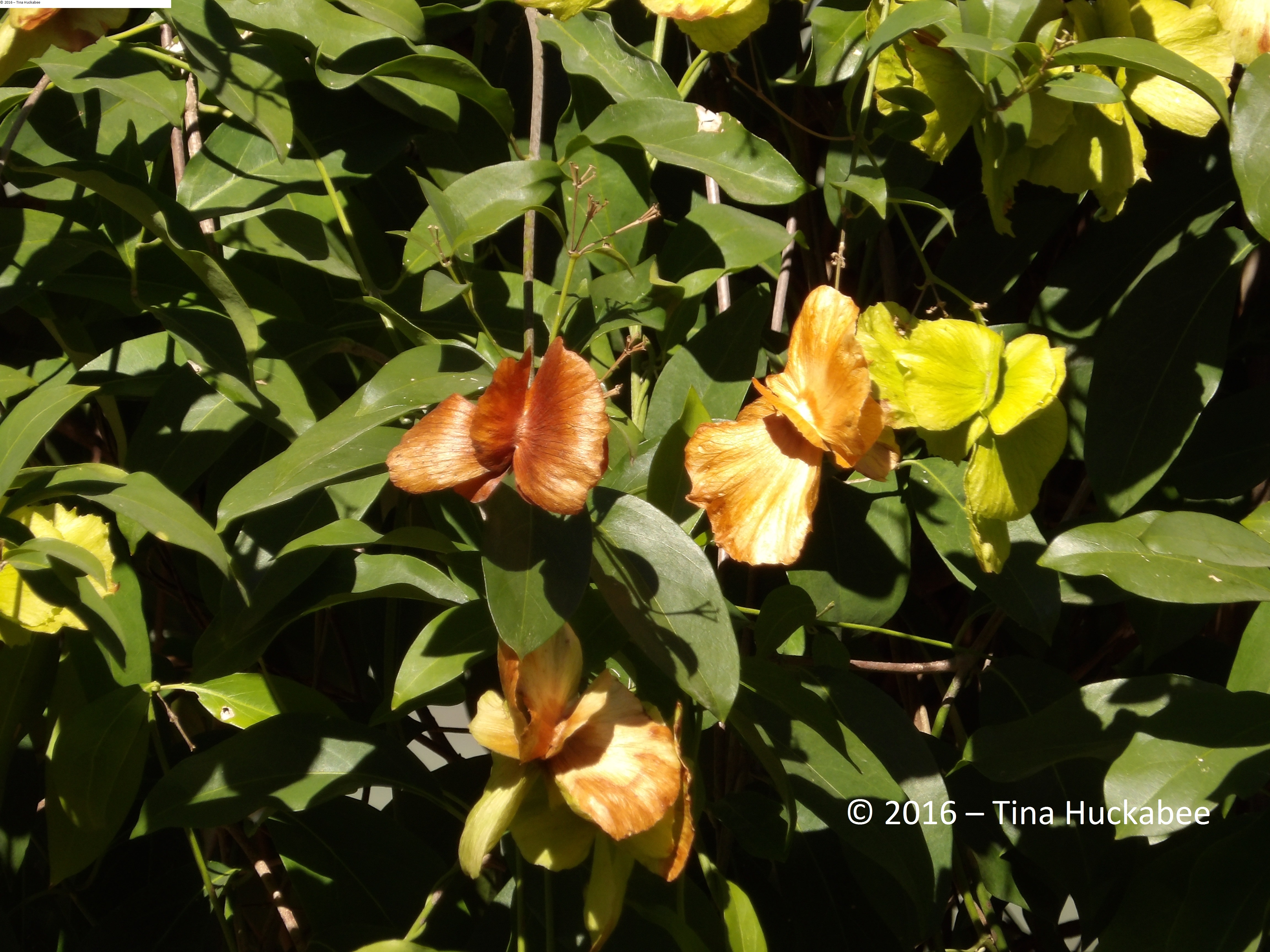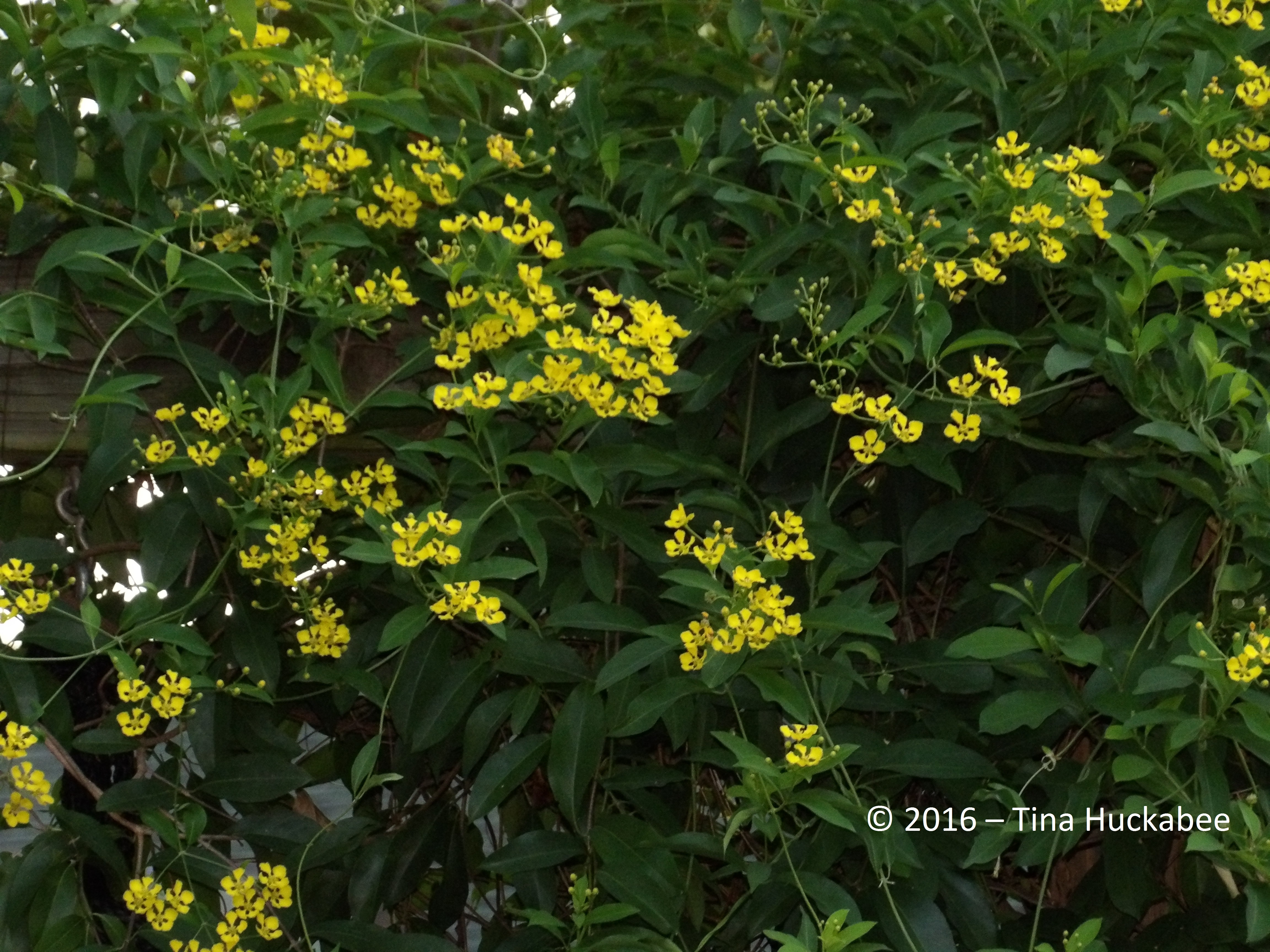 The number of bloom clusters also varies according to rainfall or irrigation. I don’t water much–just twice per month during summer–but if there’s decent rainfall in late July, August, or September, the vine yellows-up nicely. The vine weathers drought beautifully; I’ve never seen it wilt, nor does it lose leaves during that time. But for its yellow beauties to perform, some extra wet stuff is an appreciated must.