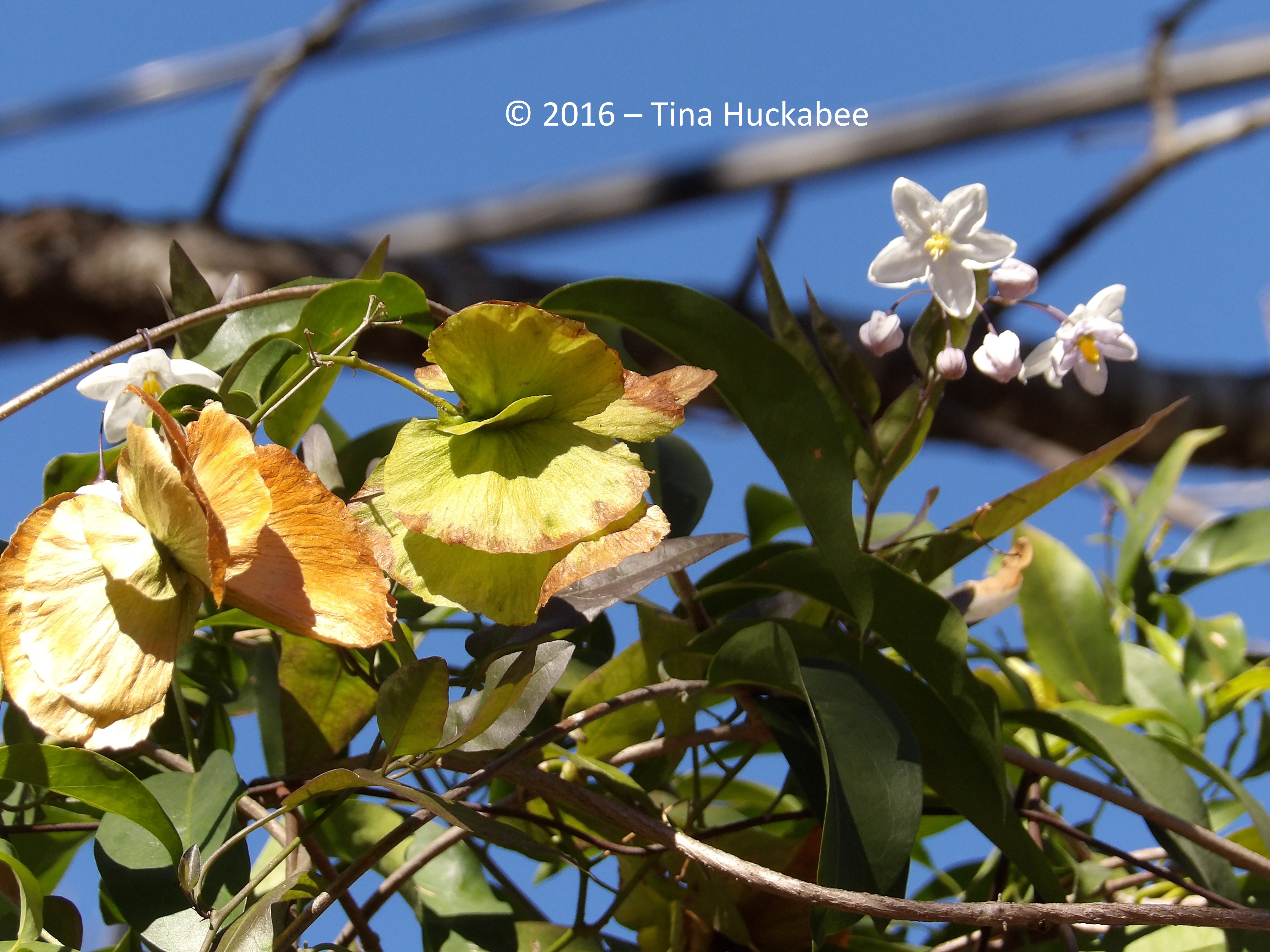 My Butterfly vine grows in an opposite situation, receiving only dappled or diffused light, depending on the season. Yet it thrives with the same great qualities as in full sun, though with fewer blooms most years. The only maintenance that I employ with this vine is the same one that I do with my hair: tuck away those annoying, wayward tendrils that fall into my face! I’ve never experienced any negative issues with this vine: no debilitating diseases, no invasive insects.