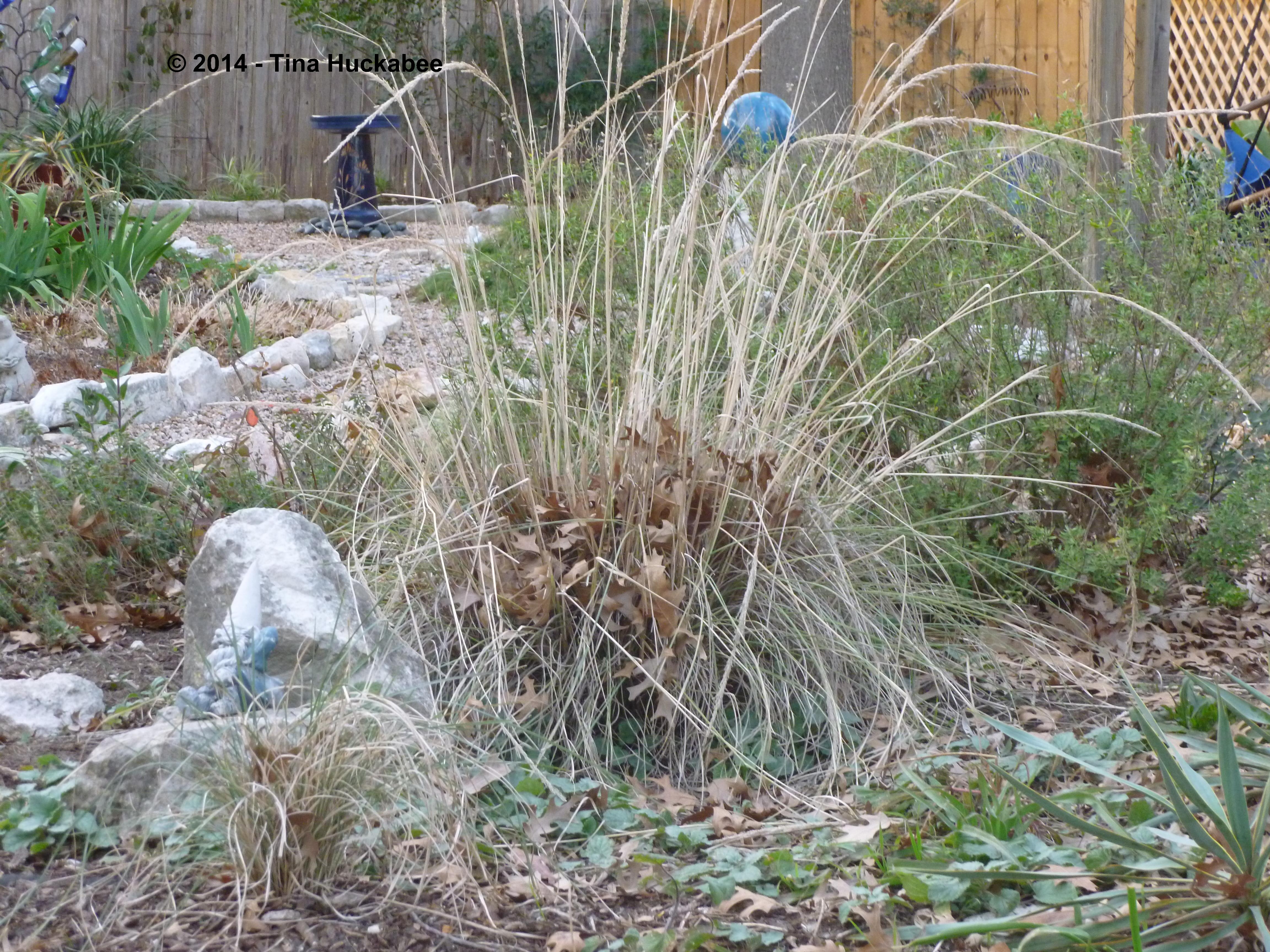 Spring and summer silvery Mexican Feather Grass, Nassella tenuissima, have switched their colors to autumn toasty, with a hint of sage. These small grasses fit well in a variety of settings and like all the native grasses, are tough, hardy plants. I’ve had more luck with this grass in part-shade, but am pleased with how they’ve fared in full sun.