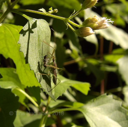 I pity the poor dove, but Cooper’s Hawks must eat and in urban landscapes, White- winged doves are plentiful, and some are destined to become food. I have no photos of this dove hunt, but did spy a similar scenario while observing a pollination palooza on my White mistflower, Ageratina havanensis. As I watched and photographed a variety of bees, butterflies, and flies, I saw a type of assassin bug, Zelus luridus, atop a leaf, clutching a native Ceratina bee.