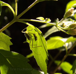 After a few seconds of my hovering over the insect and its prey, the assassin was nervous at my presence (maybe I wanted in on the bee-for-dinner action?) and scuttled under the same leaf for cover. I followed,