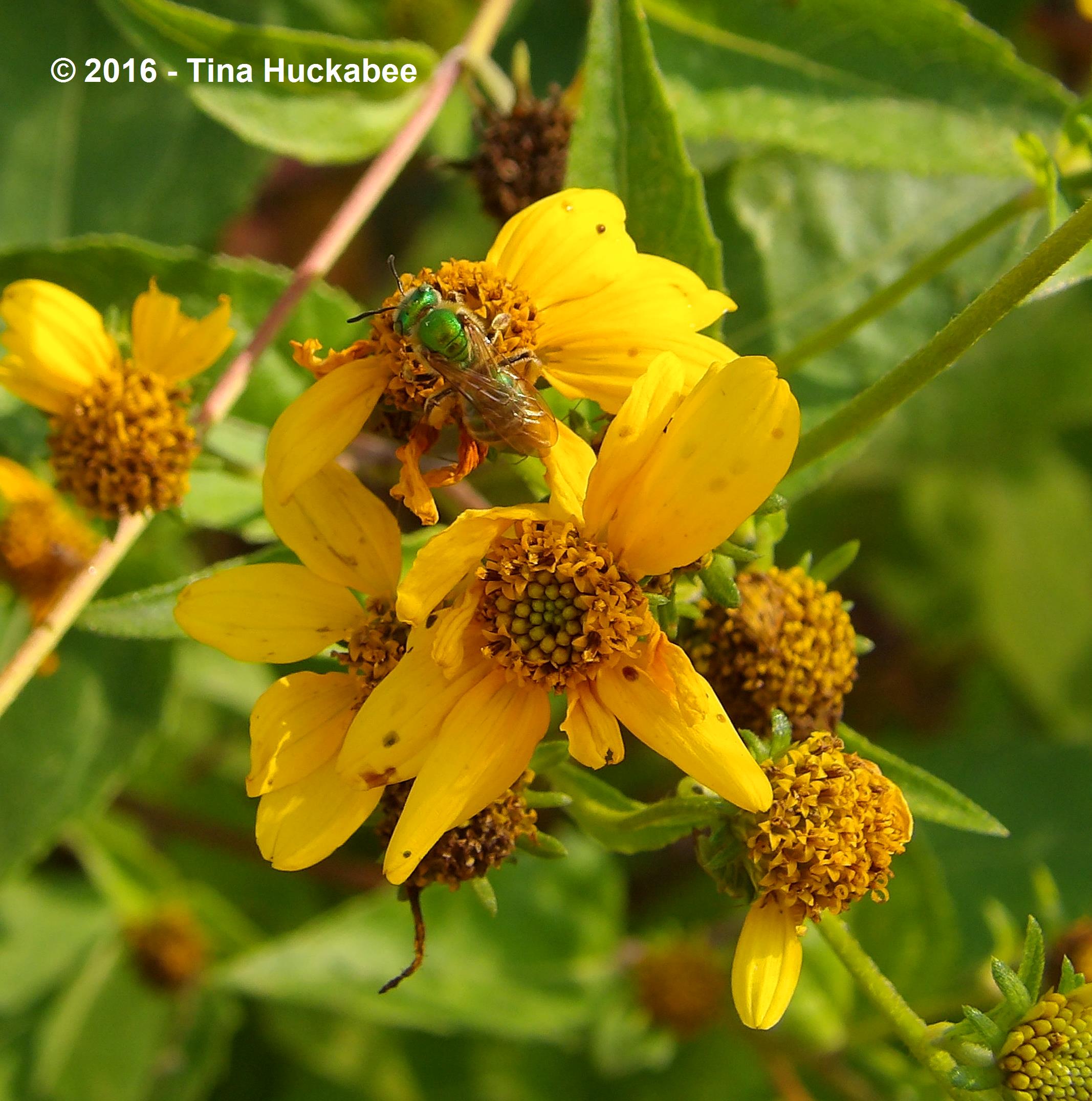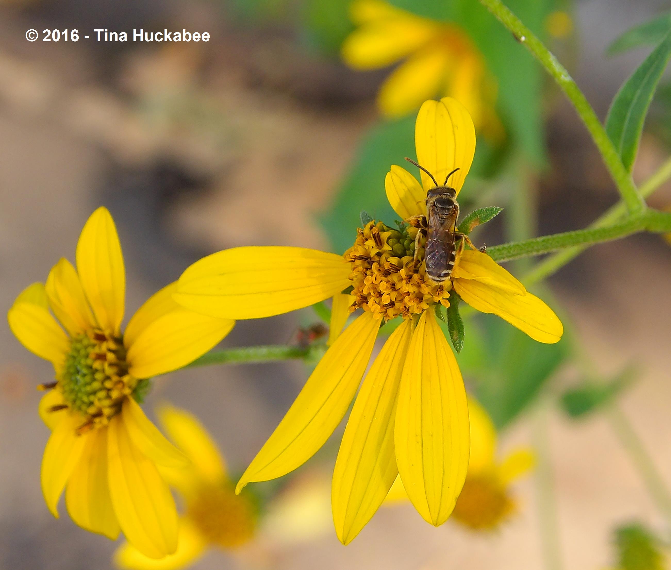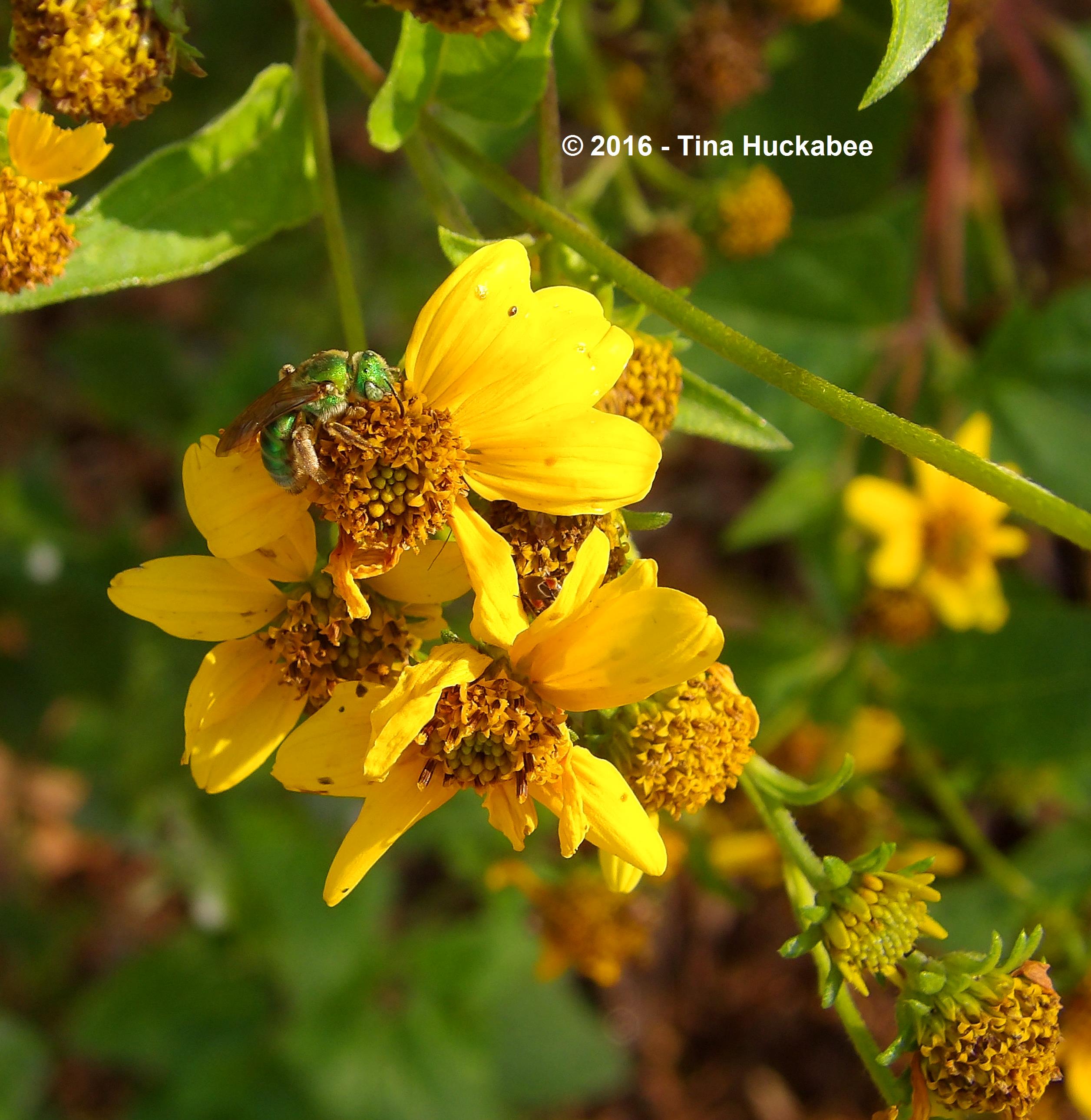 Though rare, this species of wild bee are seen in this part of Texas. I was pleased to watch her work the flowers of a Goldeneye, Viguiera dentata.