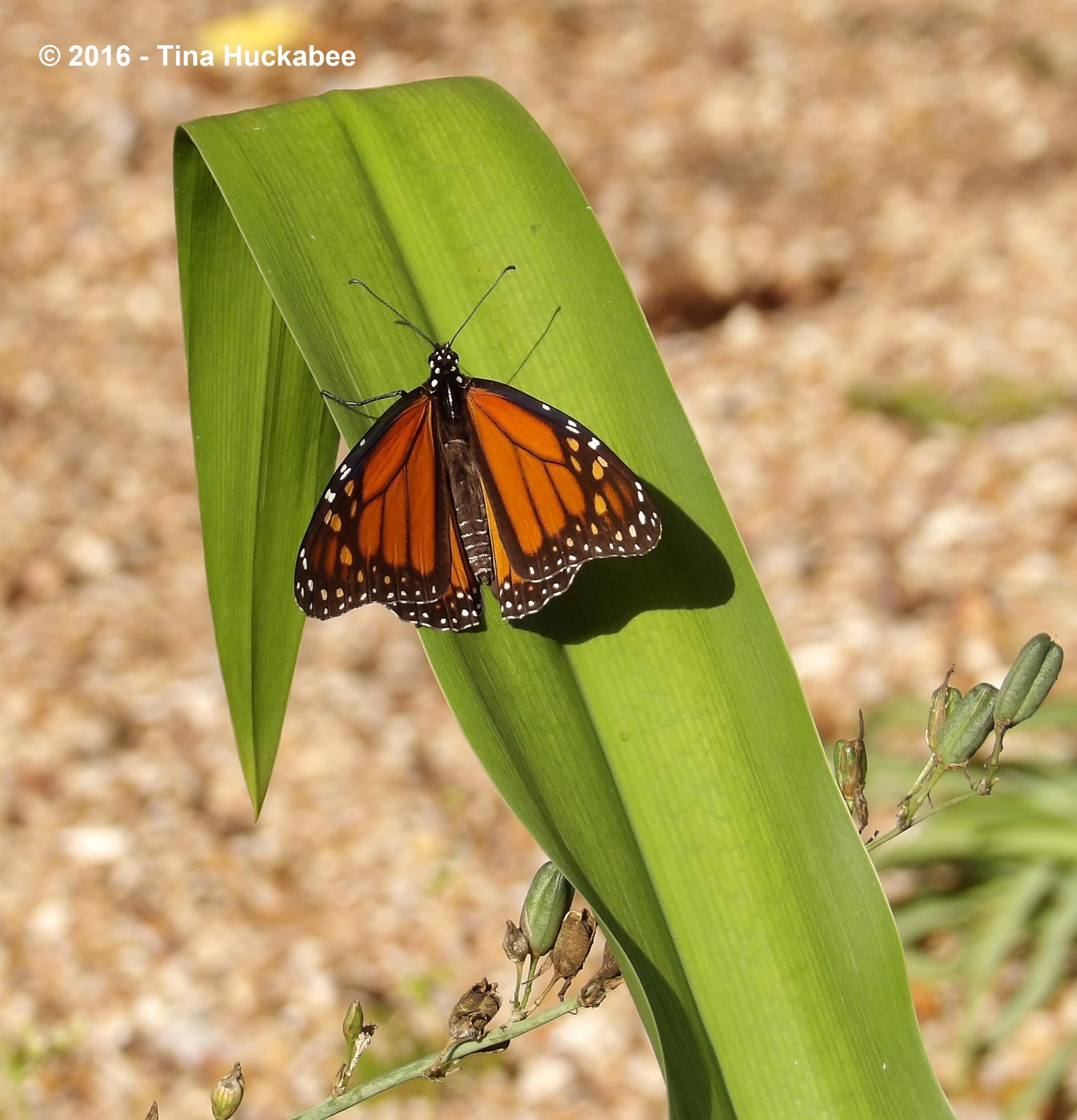 The lack of black dots on the hind wings indicates that this Monarch is a female.