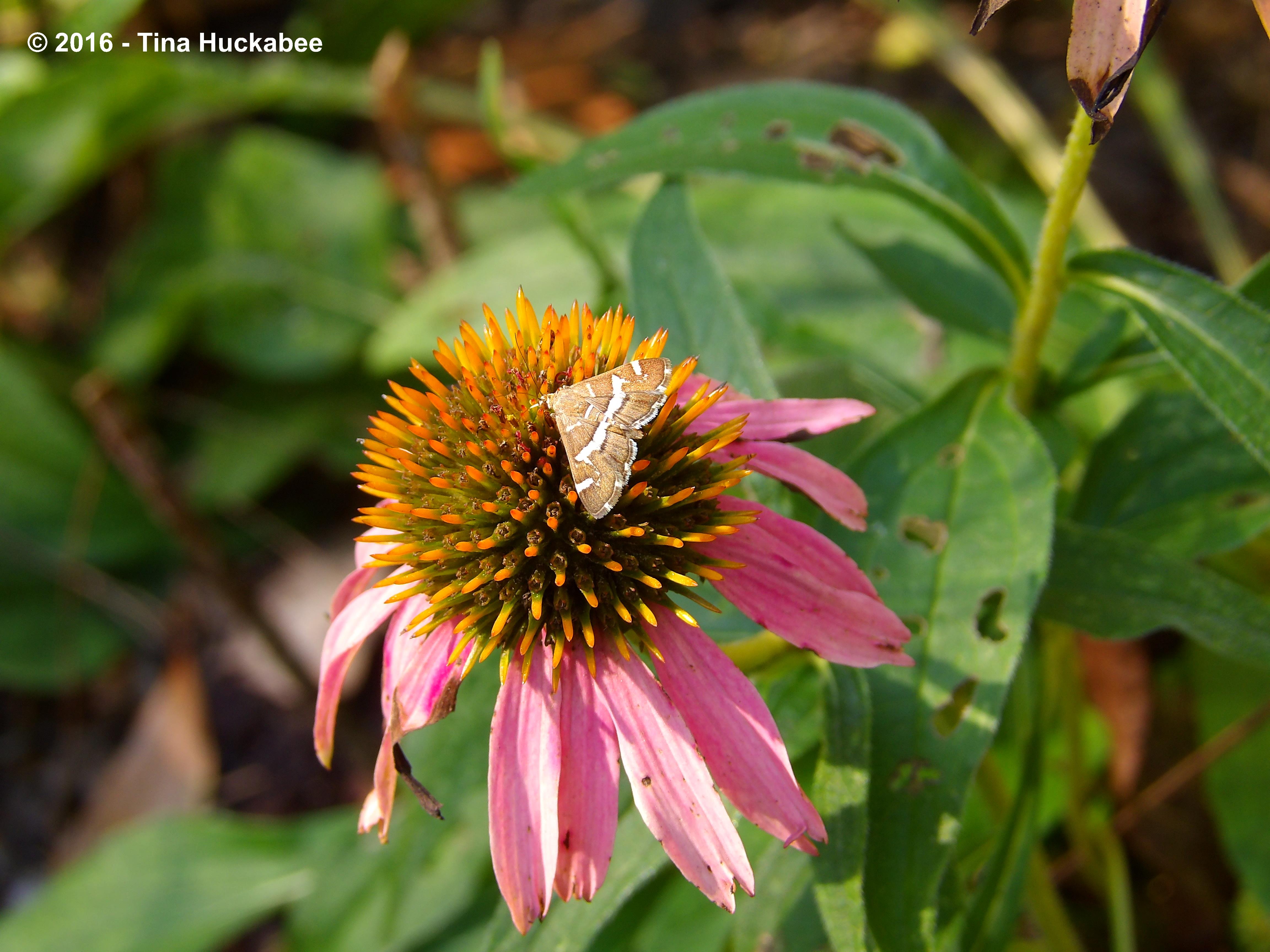 This little cutey, a Spotted Beet Webworm Moth, Hymenia perspectalis, rested on a Purple coneflower, Echinacea purpurea,