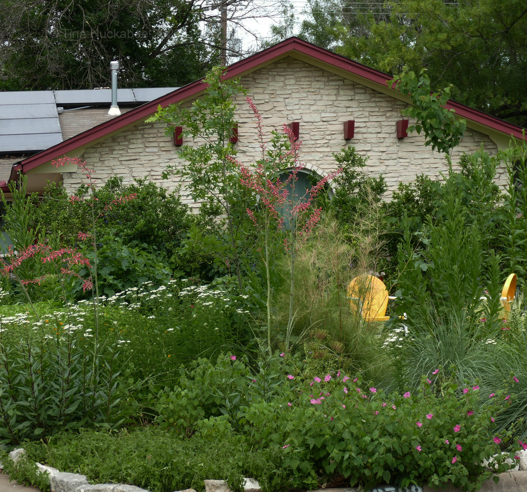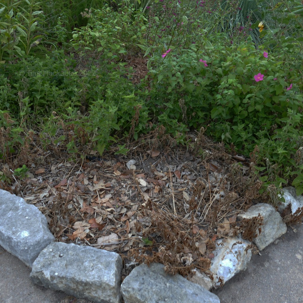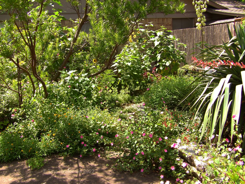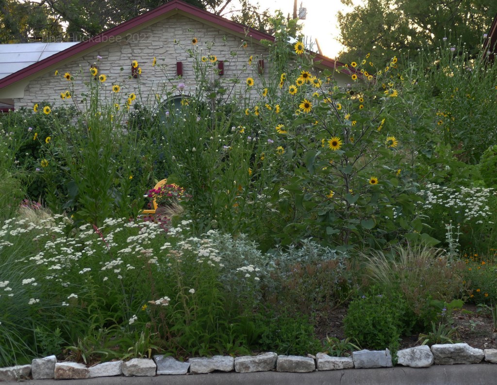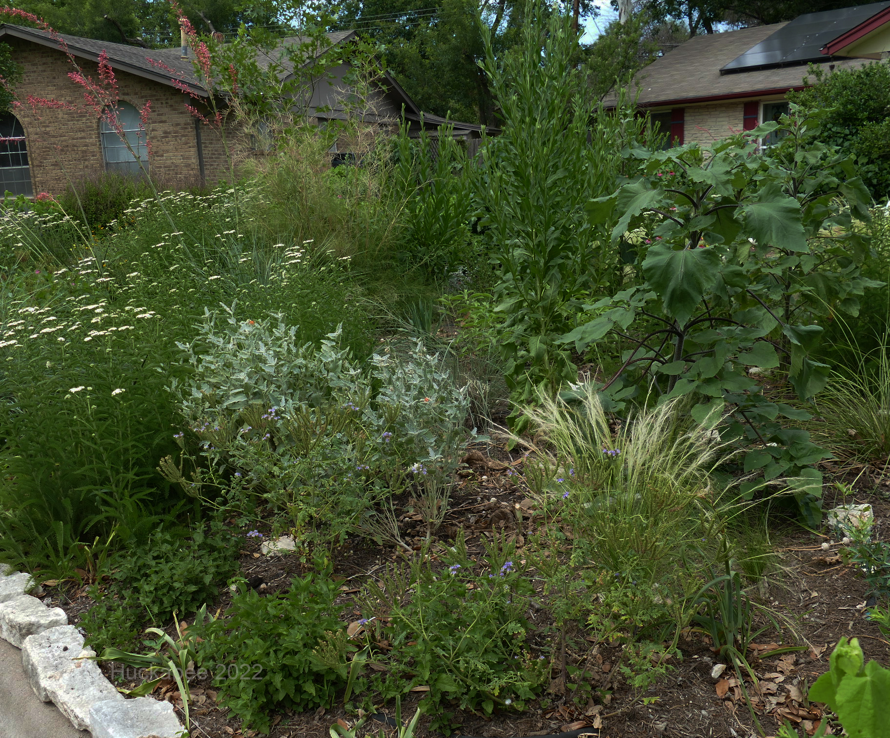 The tall 5-7 foot spikes in the background, right side of the photo, are American Basket flowers, Centaurea americana, and in the middle of the garden, you can see the large leaves of a couple of common sunflowers, which have grown to 6-8 feet. Both of these annuals have bloomed since late May, providing for pollinators, and now, as they complete their blooming cycle, for birds who are feasting on seeds. The tall plants have also allowed privacy for the seating area of the garden. I have planted several small trees and large shrubs for the long-term, but it will be a few years before they will be large enough to act as privacy screens.