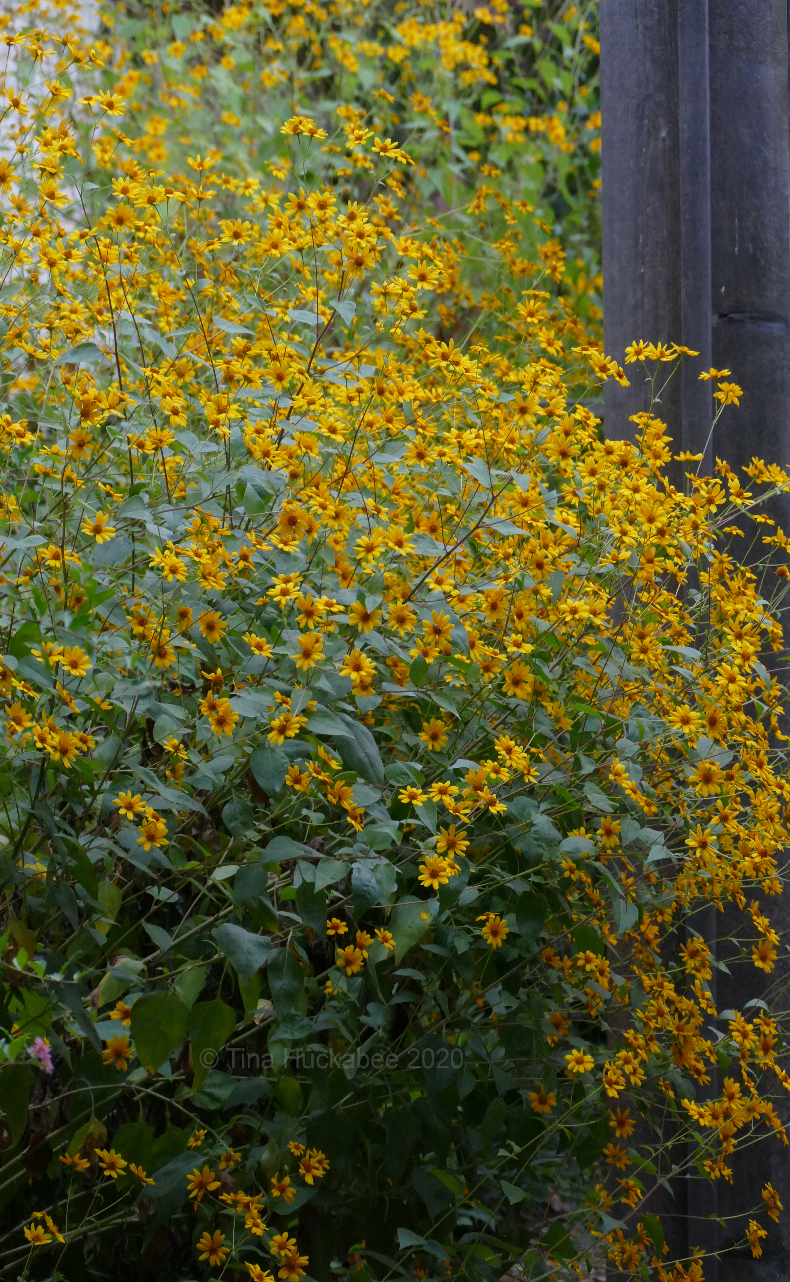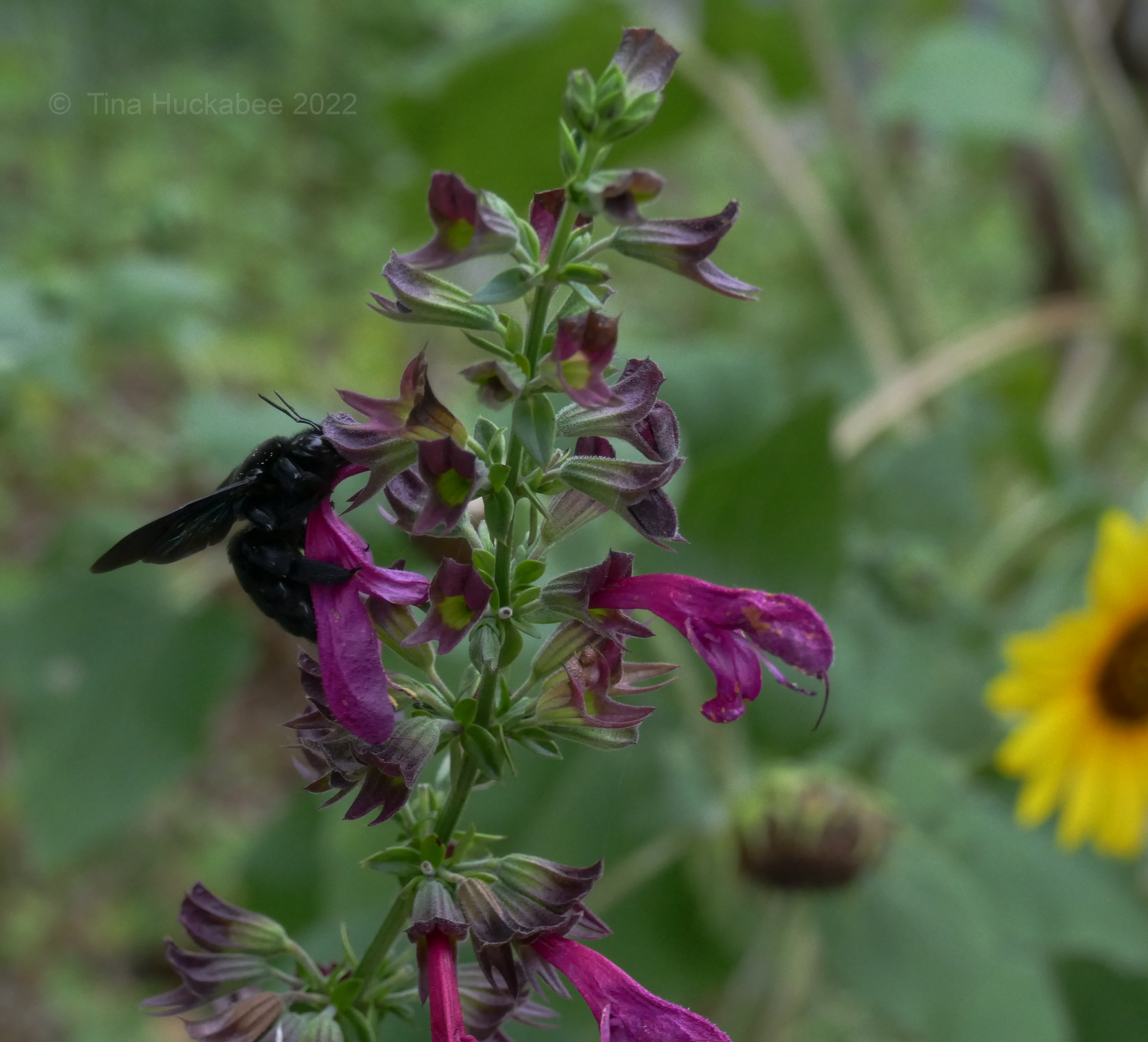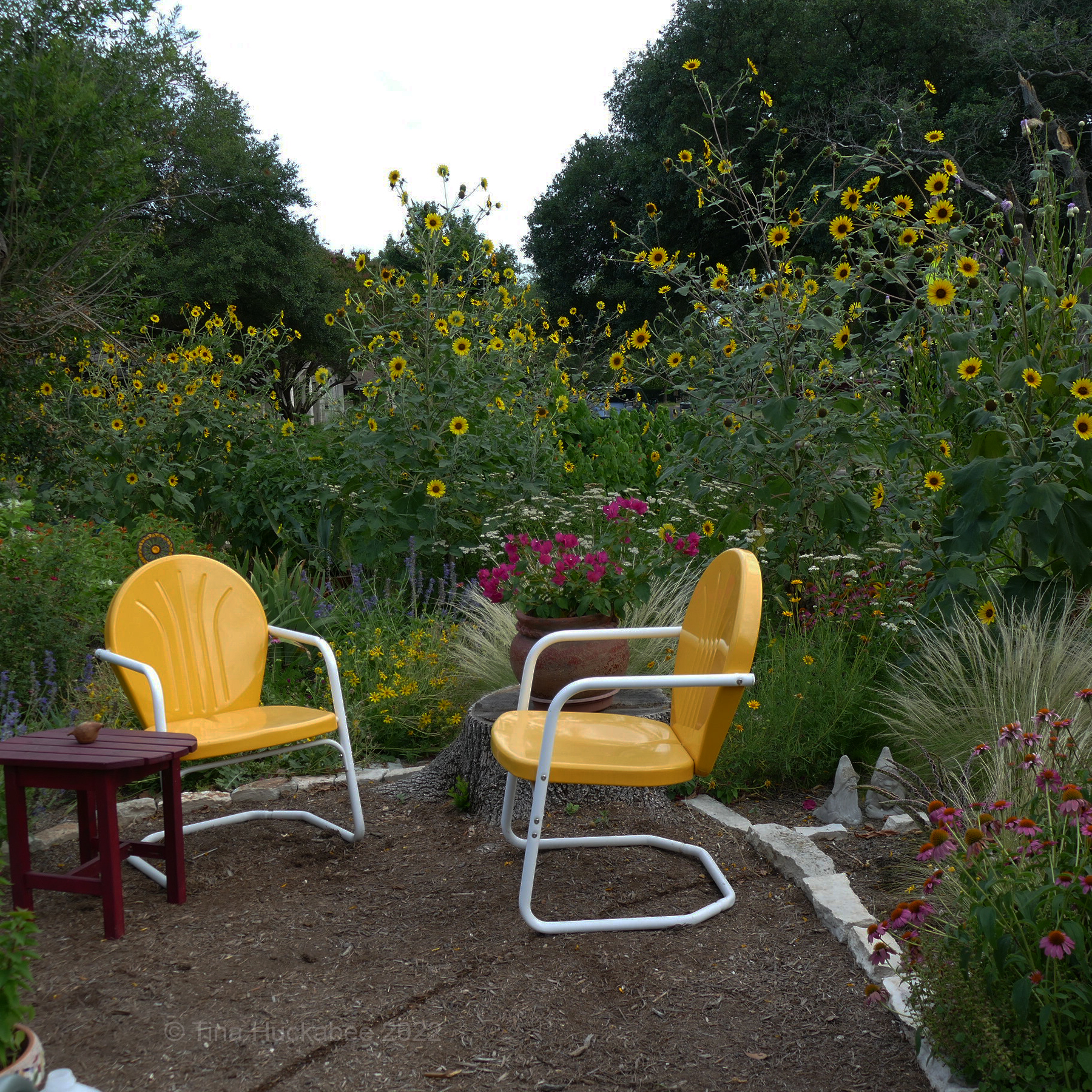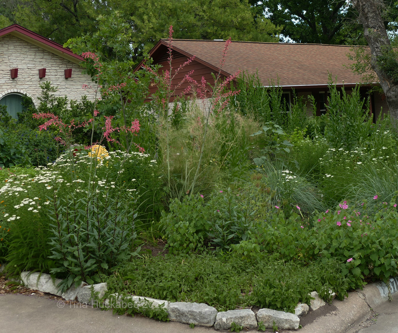 The tall 5-7 foot spikes in the background, right side of the photo, are American Basket flowers, Centaurea americana, and in the middle of the garden, you can see the large leaves of a couple of common sunflowers, which have grown to 6-8 feet. Both of these annuals have bloomed since late May, providing for pollinators, and now, as they complete their blooming cycle, for birds who are feasting on seeds. The tall plants have also allowed privacy for the seating area of the garden. I have planted several small trees and large shrubs for the long-term, but it will be a few years before they will be large enough to act as privacy screens.