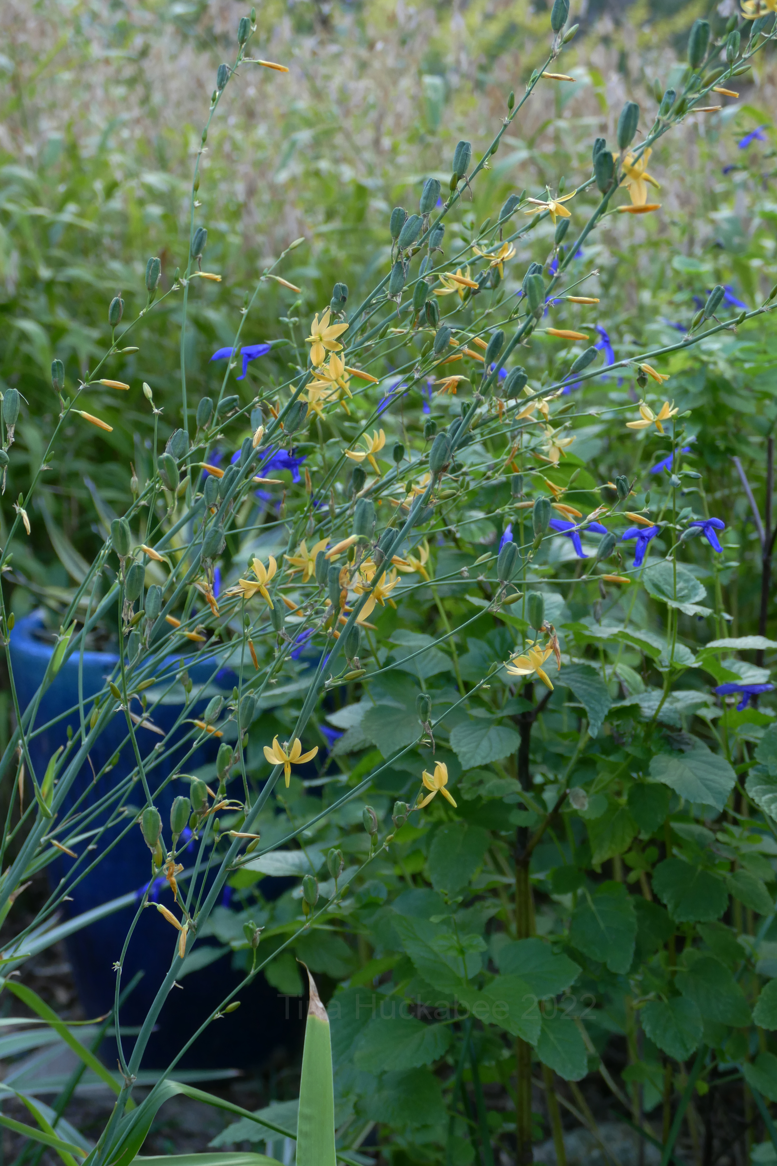 Native perennials, like cheery Engelmann’s Daisy, Engelmannia peristenia, and the blue-blooming Henry Duelberg sage, Salvia farinacea, are rock stars, happy during long weeks of heat, though even they are growing weary with the oven-like temperatures.